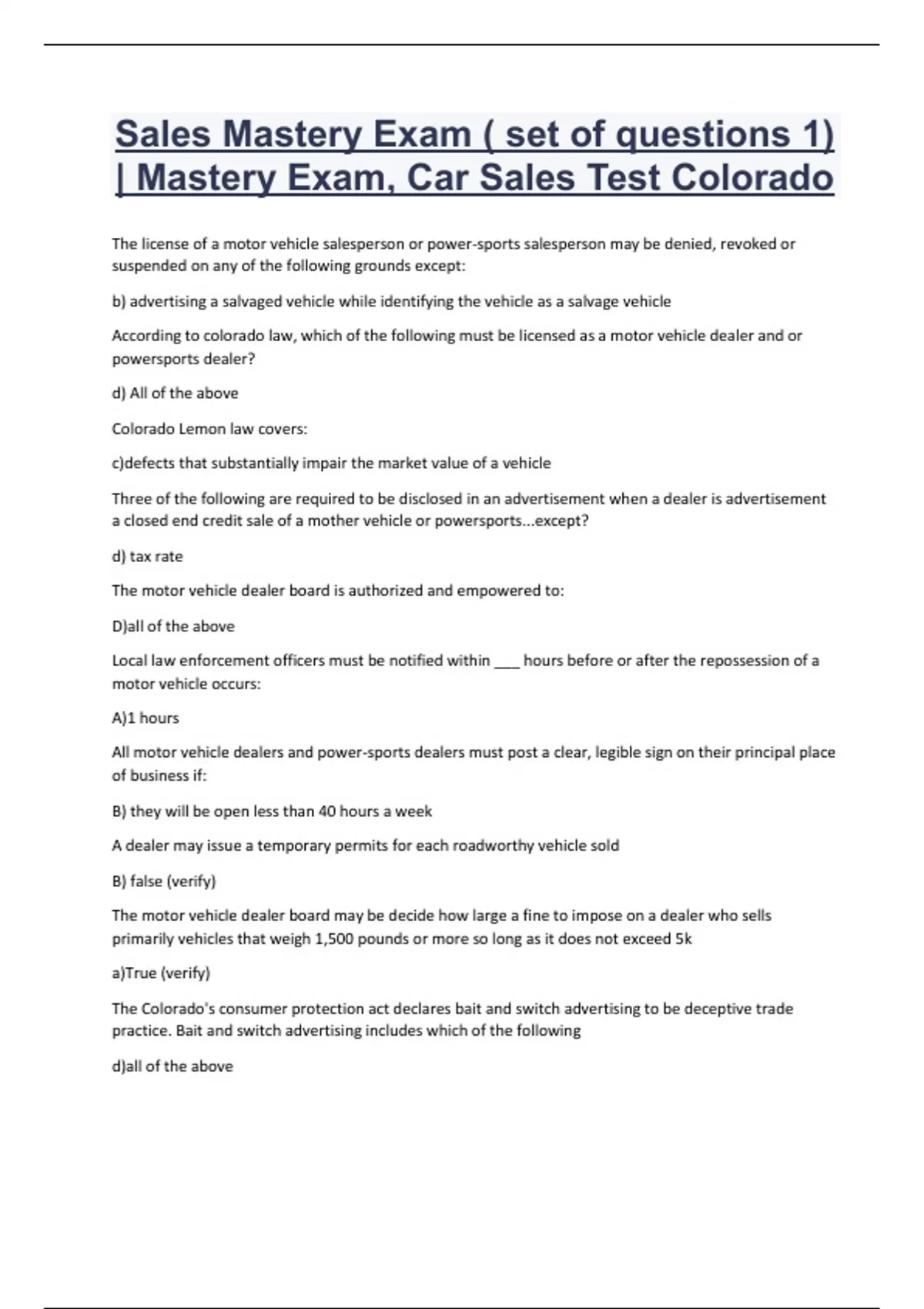 Sales Mastery Exam ( set of questions 1) | Mastery Exam, Car Sales Test Colorado