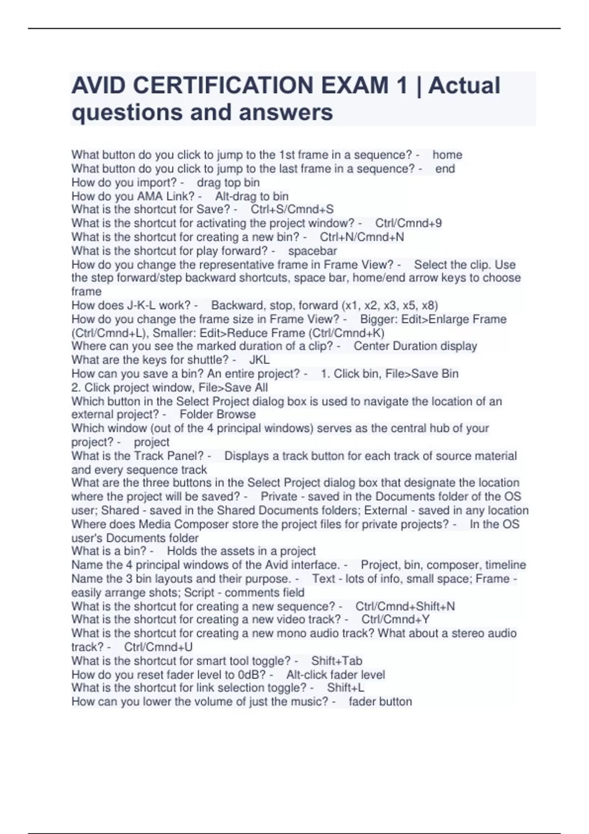 AVID CERTIFICATION EXAM 1 | Actual questions and answers What button do you click to jump to the 1st frame in a sequence? - home What button do you click to jump to the last frame in a sequence? - end How do you import? - drag top bin How do you AMA Link? - Alt-drag to bin What is the shortcut for Save? - Ctrl+S/Cmnd+S What is the shortcut for activating the project window? - Ctrl/Cmnd+9 What is the shortcut for creating a new bin? - Ctrl+N/Cmnd+N What is the shortcut for play forward? - spacebar How do you change the representative frame in Frame View? - Select the clip. Use the step forward/step backward shortcuts, space bar, home/end arrow keys to choose frame How does J-K-L work? - Backward, stop, forward (x1, x2, x3, x5, x8) How do you change the frame size in Frame View? - Bigger: EditEnlarge Frame (Ctrl/Cmnd+L), Smaller: EditReduce Frame (Ctrl/Cmnd+K) Where can you see the marked duration of a clip? - Center Duration display What are the keys for shuttle? - JKL How can you save a bin? An entire project? - 1. Click bin, FileSave Bin 2. Click project window, FileSave All Which button in the Select Project dialog box is used to navigate the location of an external project? - Folder Browse Which window (out of the 4 principal windows) serves as the central hub of your project? - project What is the Track Panel? - Displays a track button for each track of source material and every sequence track What are the three buttons in the Select Project dialog box that designate the location where the project will be saved? - Private - saved in the Documents folder of the OS user; Shared - saved in the Shared Documents folders; External - saved in any location Where does Media Composer store the project files for private projects? - In the OS user's Documents folder What is a bin? - Holds the assets in a project Name the 4 principal windows of the Avid interface. - Project, bin, composer, timeline Name the 3 bin layouts and their purpose. - Text - lots of info, small space; Frame - easily arrange shots; Script - comments field What is the shortcut for creating a new sequence? - Ctrl/Cmnd+Shift+N What is the shortcut for creating a new video track? - Ctrl/Cmnd+Y What is the shortcut for creating a new mono audio track? What about a stereo audio track? - Ctrl/Cmnd+U What is the shortcut for smart tool toggle? - Shift+Tab How do you reset fader level to 0dB? - Alt-click fader level What is the shortcut for link selection toggle? - Shift+L How can you lower the volume of just the music? - fader button Why is Overwrite mode well-suited for audio editing? - Audio tracks naturally have gaps of filler between segments What is digital audio scrub and how is it enabled? - Plays audio associated with each frame as you move the position indicator through the sequence. Hold Shift key while dragging; CAPS LOCK T or F. Splice-In never affects track/sequence duration. - false What are 2 ways to create a new sequence? - 1. Right-click in timeline and choose New Sequence. 2. Select clipNew Sequence What type of edit does Splice-In perform? - insert Name one method/shortcut to adjust the clip gain besides dragging the mini fader. - Click icons, then use up/down arrow keys What modifier keys allow you to snap to edit points in the timeline? - Ctrl - to snap the head of the moving segment to edit points; Ctrl+alt - to snap the tail of the moving segment to edit points What is an easy way to select segments in segment mode? - Lasso left to right What is the shortcut for entering/exiting trim mode? - u key How do you t