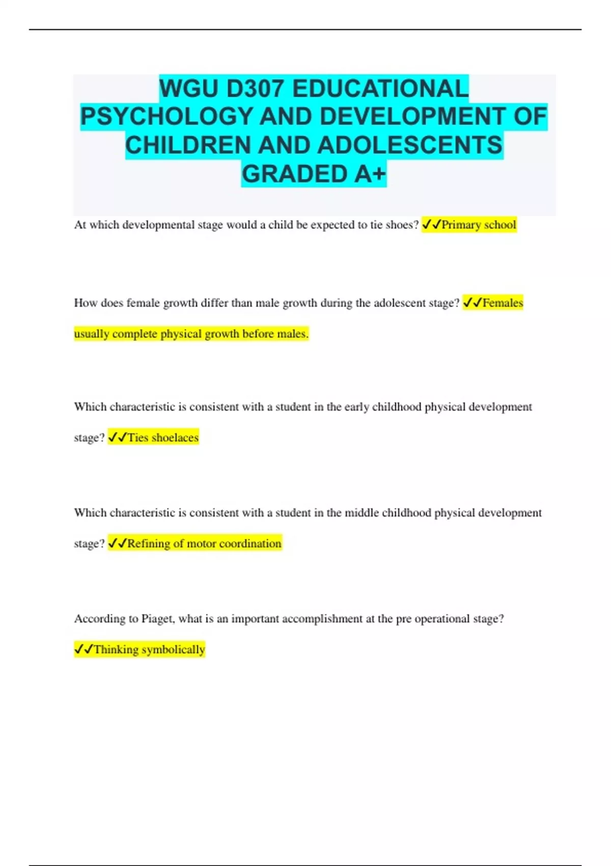 WGU D307 EDUCATIONAL PSYCHOLOGY AND DEVELOPMENT OF CHILDREN AND ADOLESCENTS GRADED A+