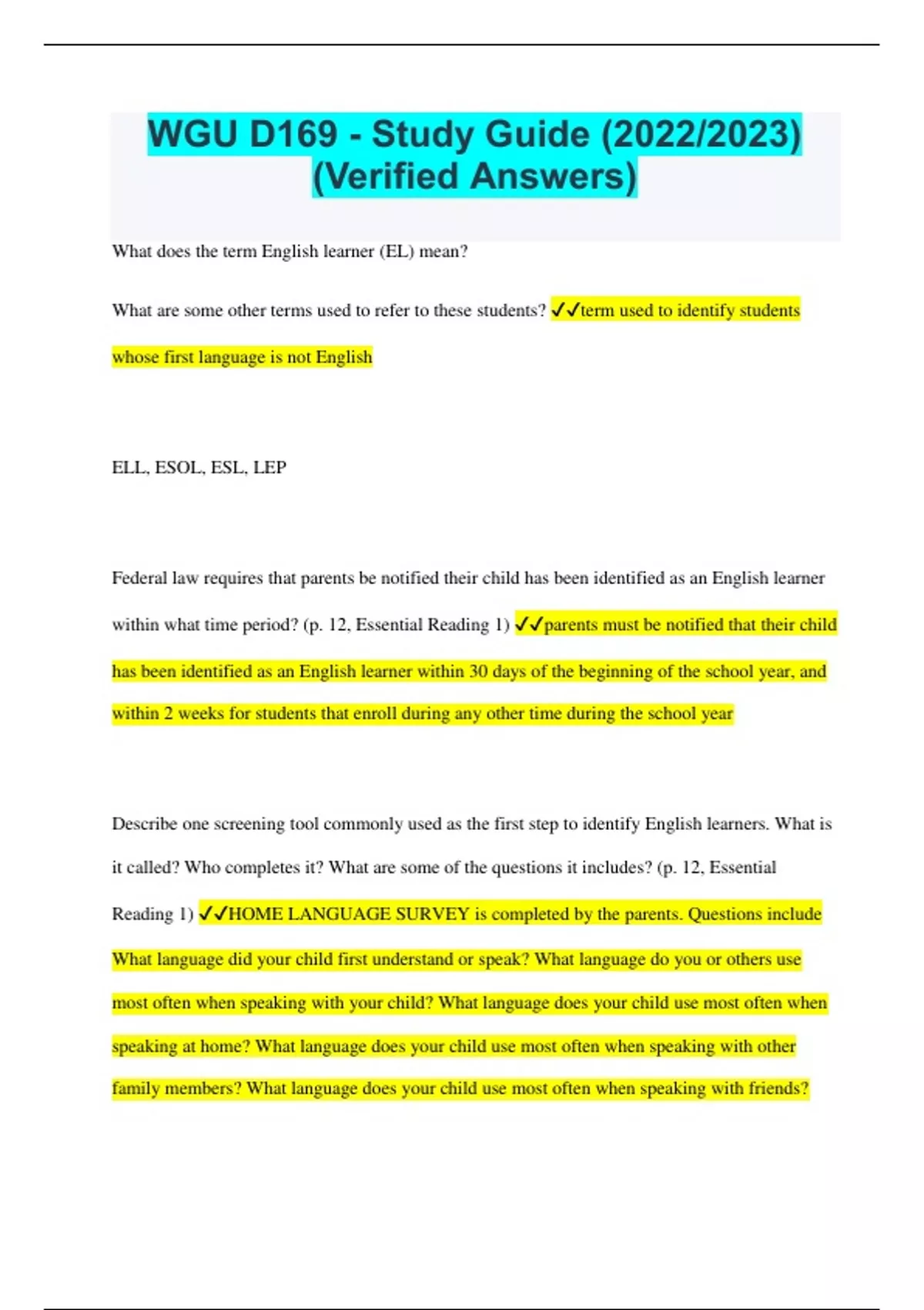 What does the term English learner (EL) mean? What are some other terms used to refer to these students? term used to identify students whose first language is not English ELL, ESOL, ESL, LEP Federal law requires that parents be notified their child has been identified as an English learner within what time period? (p. 12, Essential Reading 1) parents must be notified that their child has been identified as an English learner within 30 days of the beginning of the school year, and within 2 weeks for students that enroll during any other time during the school year Describe one screening tool commonly used as the first step to identify English learners. What is it called? Who completes it? What are some of the questions it includes? (p. 12, Essential Reading 1) HOME LANGUAGE SURVEY is completed by the parents. Questions include What language did your child first understand or speak? What language do you or others use most often when speaking with your child? What language does your child use most often when speaking at home? What language does your child use most often when speaking with other family members? What language does your child use most often when speaking with friends?