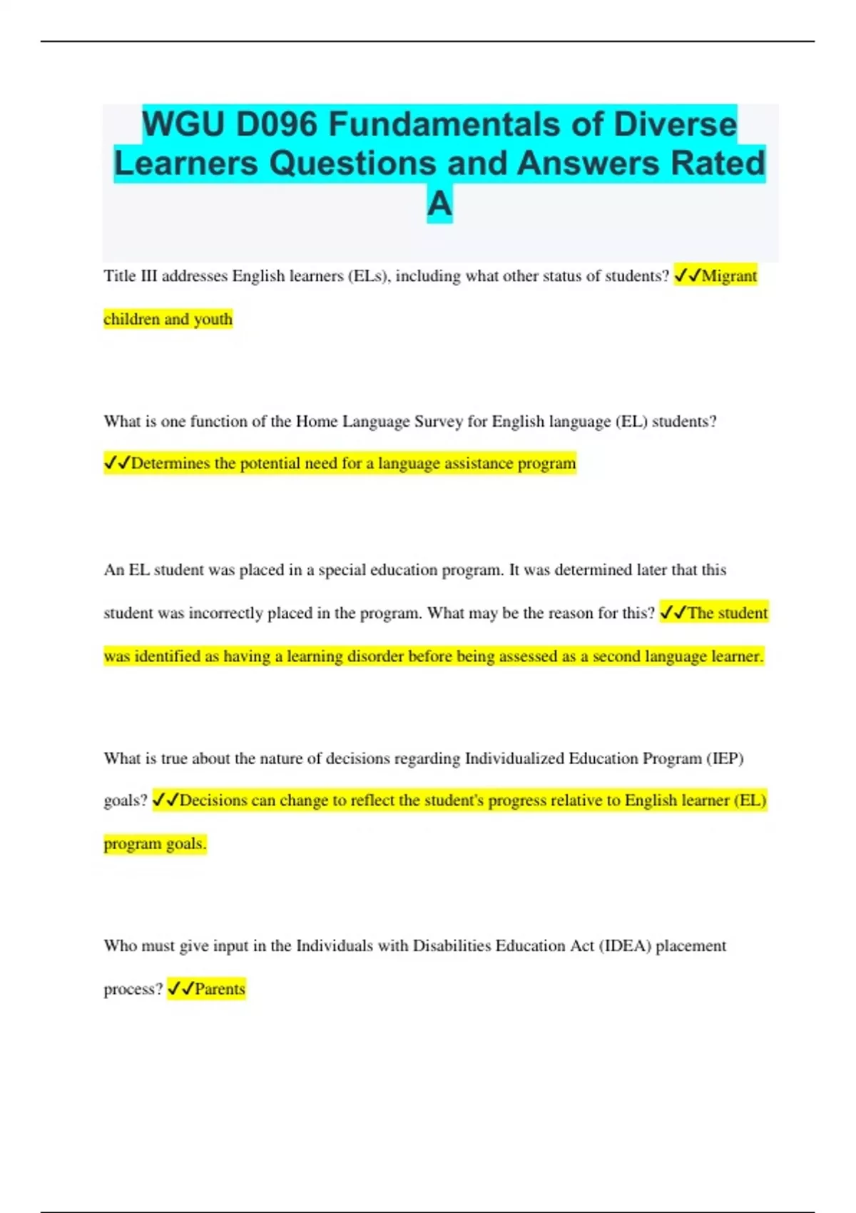 WGU D096 Fundamentals of Diverse Learners Questions and Answers Rated A