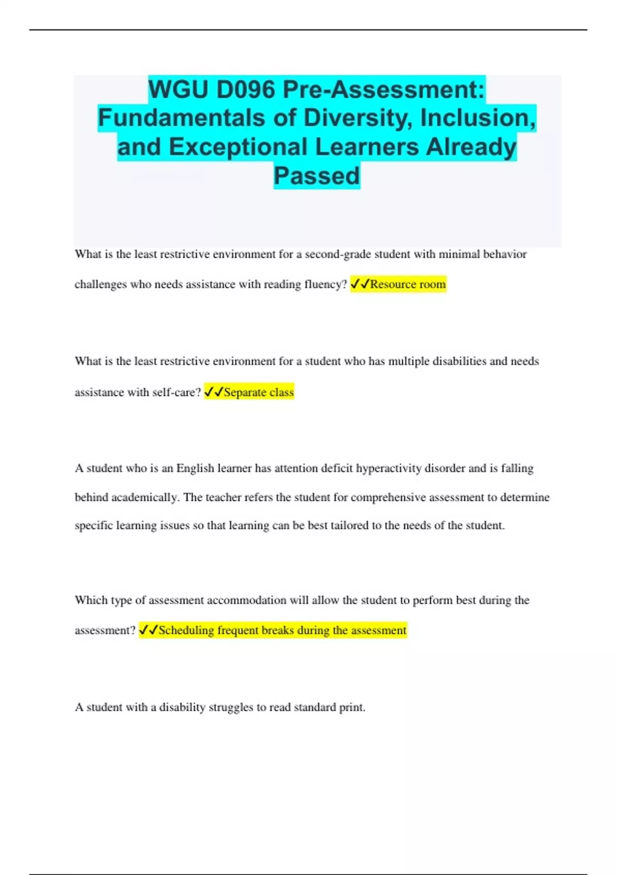 WGU D096 Pre-Assessment: Fundamentals of Diversity, Inclusion, and Exceptional Learners Already Passed