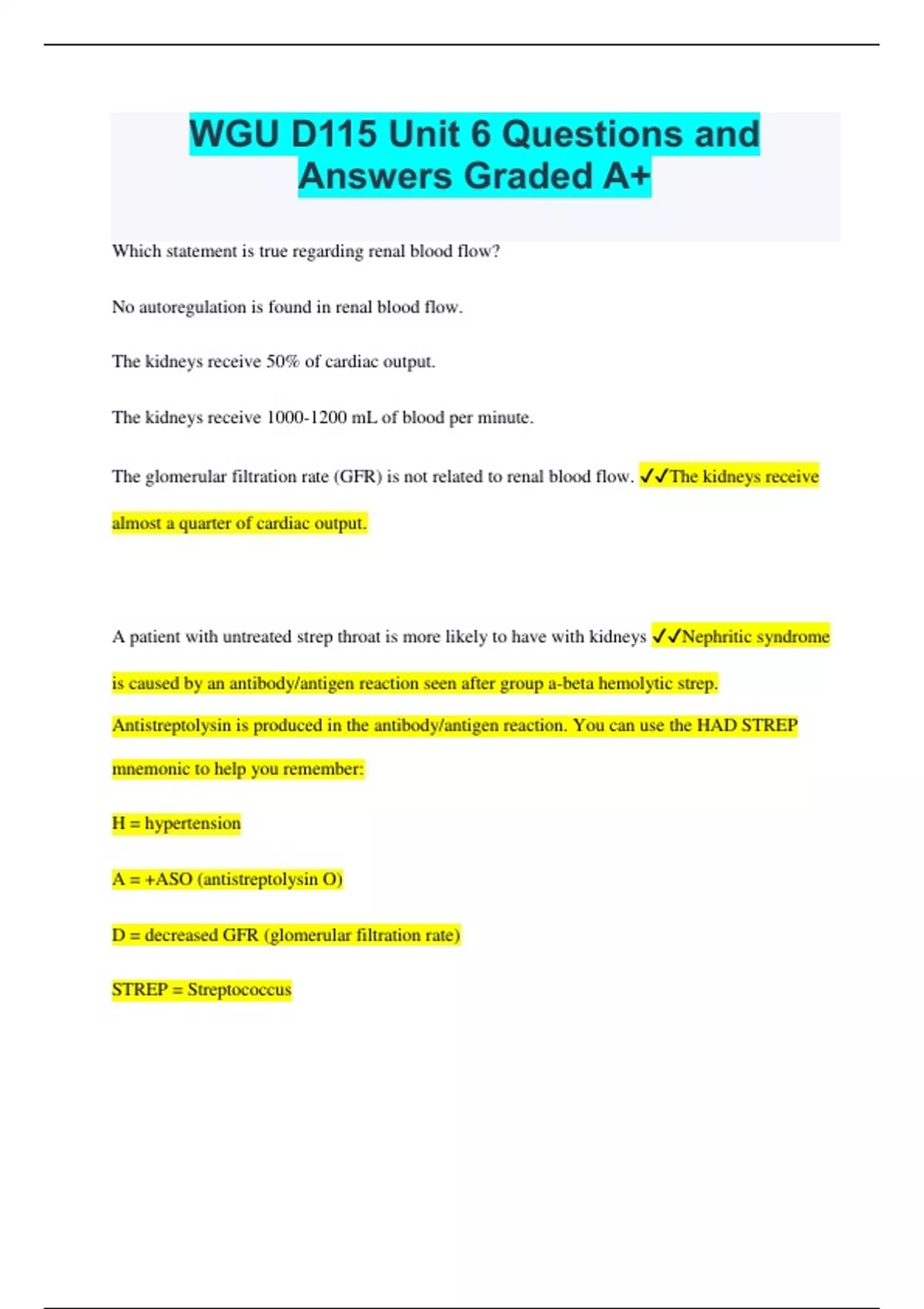 Which statement is true regarding renal blood flow? No autoregulation is found in renal blood flow. The kidneys receive 50% of cardiac output. The kidneys receive mL of blood per minute. The glomerular filtration rate (GFR) is not related to renal blood flow. The kidneys receive almost a quarter of cardiac output. A patient with untreated strep throat is more likely to have with kidneys Nephritic syndrome is caused by an antibody/antigen reaction seen after group a-beta hemolytic strep. Antistreptolysin is produced in the antibody/antigen reaction. You can use the HAD STREP mnemonic to help you remember: H = hypertension A = +ASO (antistreptolysin O) D = decreased GFR (glomerular filtration rate) STREP = Streptococcus