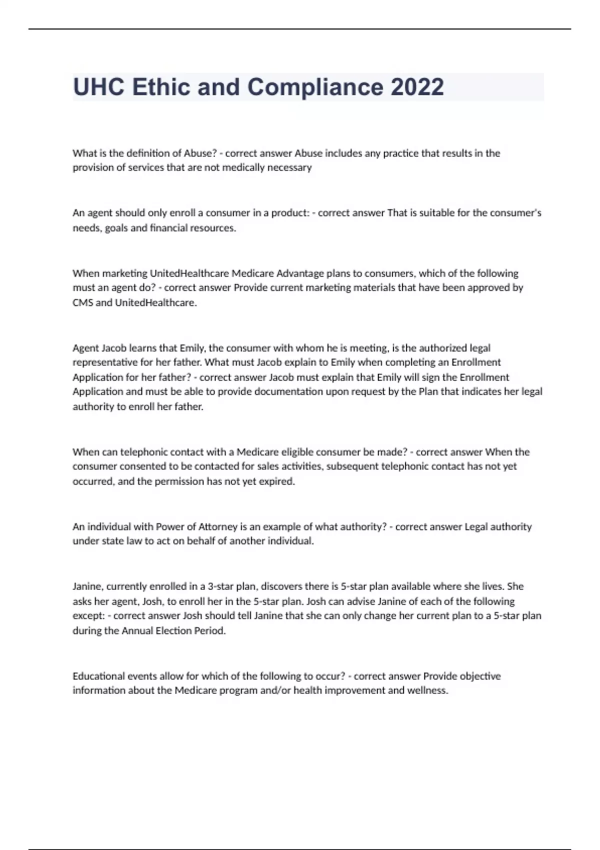 UHC Ethic and Compliance 2022. What is the definition of Abuse? - correct answer Abuse includes any practice that results in the provision of services that are not medically necessary An agent should only enroll a consumer in a product: - correct answer That is suitable for the consumer's needs, goals and financial resources. When marketing UnitedHealthcare Medicare Advantage plans to consumers, which of the following must an agent do? - correct answer Provide current marketing materials that have been approved by CMS and UnitedHealthcare. Agent Jacob learns that Emily, the consumer with whom he is meeting, is the authorized legal representative for her father. What must Jacob explain to Emily when completing an Enrollment Application for her father? - correct answer Jacob must explain that Emily will sign the Enrollment Application and must be able to provide documentation upon request by the Plan that indicates her legal authority to enroll her father. When can telephonic contact with a Medicare eligible consumer be made? - correct answer When the consumer consented to be contacted for sales activities, subsequent telephonic contact has not yet occurred, and the permission has not yet expired. An individual with Power of Attorney is an example of what authority? - correct answer Legal authority under state law to act on behalf of another individual. Janine, currently enrolled in a 3-star plan, discovers there is 5-star plan available where she lives. She asks her agent, Josh, to enroll her in the 5-star plan. Josh can advise Janine of each of the following except: - correct answer Josh should tell Janine that she can only change her current plan to a 5-star plan during the Annual Election Period. Educational events allow for which of the following to occur? - correct answer Provide objective information about the Medicare program and/or health improvement and wellness. Dino, an agent, received a phone call on September 29 from a consumer interested in Medicare Advantage plans for the new plan year. Dino proceeded to verify the consumer's Medicare eligibility, describe the costs and benefit coverage of the plan, and explained that he could not accept an enrollment application until October 15. What did Dino do that was NOT compliant? - correct answer Dino presented a plan prior to October 1. Annual Election Period (AEP) is a time when: - correct answer Consumers can elect to join a Medicare Advantage Plan or switch to a different plan. What type of events must an agent report to UnitedHealthcare? - correct answer Formal and informal marketing/sales events Which of the following are the ways to report potential FWA? - correct answer Producer Help Desk (DHP) Fraud, Waste and/or Abuse hotline What is the definition of Fraud? - correct answer Fraud is intentionally misrepresenting or concealing facts to obtain something of value. What is the purpose of the Statement of Understanding? - correct answer It ensures that when consumers sign the Medicare Advantage and/or Part D Enrollment Application they are acknowledging their understanding that they are actually enrolling, in which plan they are enrolling and standard disclosures. In what product should agents enroll consumers? - correct answer A product that is suitable for the consumer's needs, goals and financial resources. As an agent, you must not do which of the following when marketing UnitedHealthcare Medicare Advantage plans to consumers? - correct answer Use providers or provider groups to distribute printed information comparing benefits of different health plans without approval. To sign an Enrollment Application on behalf of a consumer, what authority must the individual have? - correct answer The individual must be legally authorized in the state in which the consumer resides to act on behalf of the consumer (e.g. Power of Attorney).