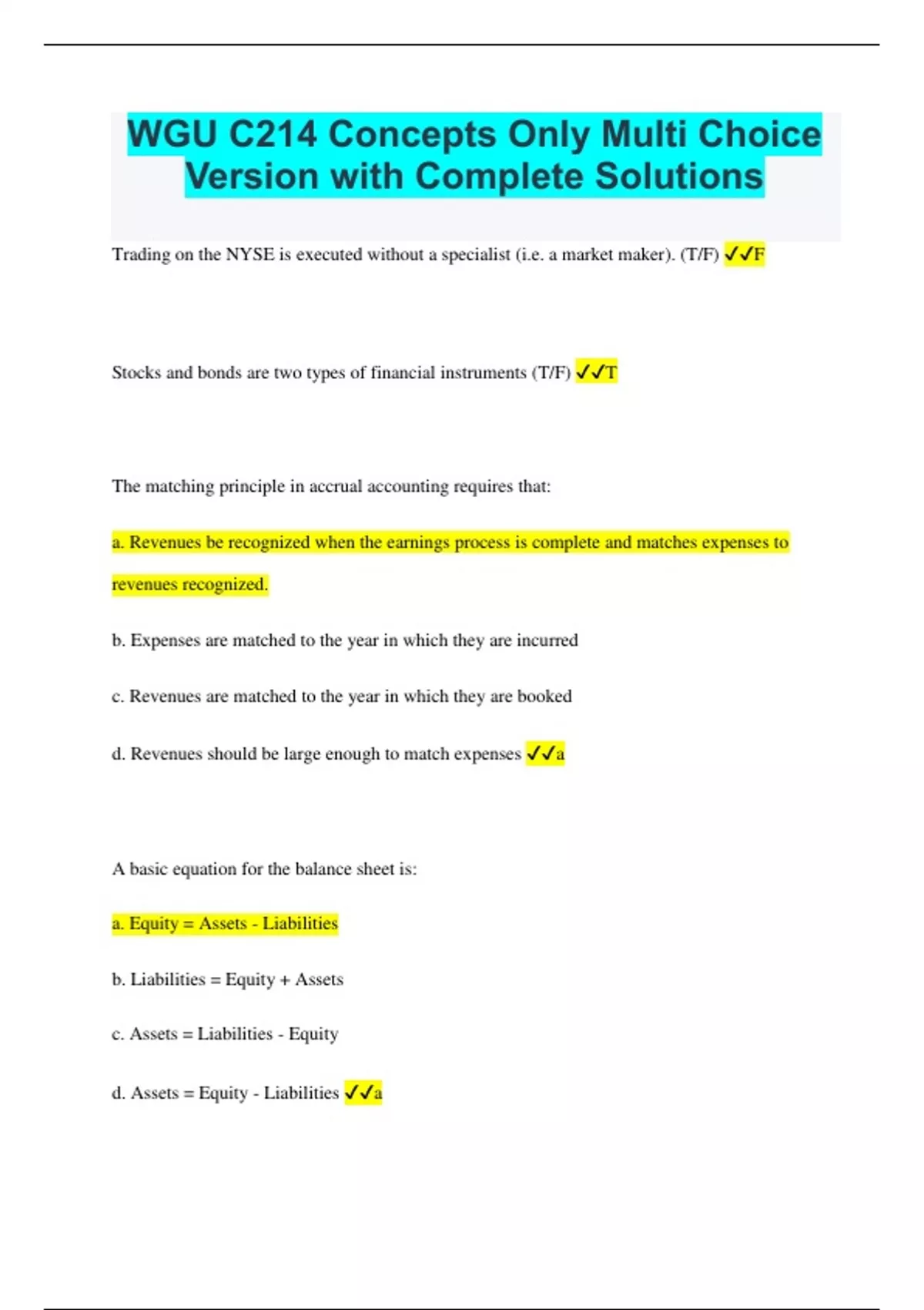 Trading on the NYSE is executed without a specialist (i.e. a market maker). (T/F) F Stocks and bonds are two types of financial instruments (T/F) T The matching principle in accrual accounting requires that: a. Revenues be recognized when the earnings process is complete and matches expenses to revenues recognized. b. Expenses are matched to the year in which they are incurred c. Revenues are matched to the year in which they are booked d. Revenues should be large enough to match expenses a A basic equation for the balance sheet is: a. Equity = Assets - Liabilities b. Liabilities = Equity + Assets c. Assets = Liabilities - Equity d. Assets = Equity - Liabilities a
