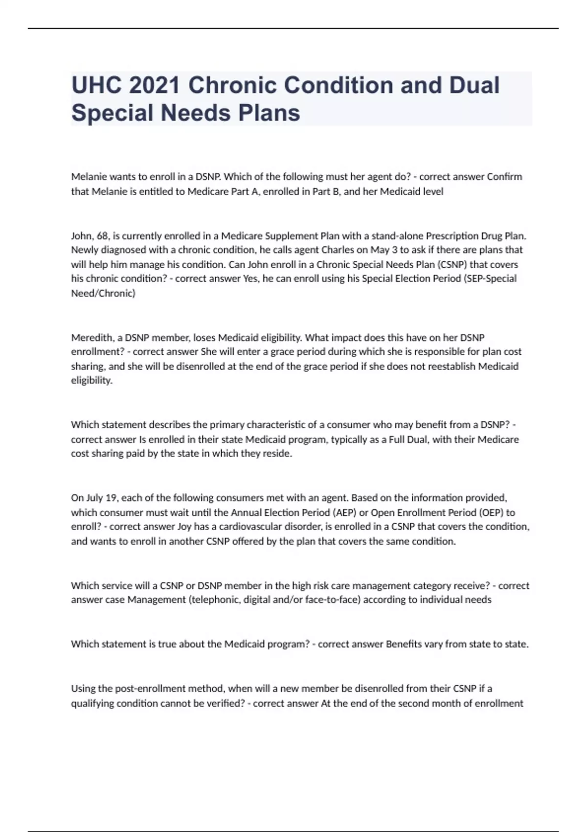 UHC 2021 Chronic Condition and Dual Special Needs Plans Melanie wants to enroll in a DSNP. Which of the following must her agent do? - correct answer Confirm that Melanie is entitled to Medicare Part A, enrolled in Part B, and her Medicaid level John, 68, is currently enrolled in a Medicare Supplement Plan with a stand-alone Prescription Drug Plan. Newly diagnosed with a chronic condition, he calls agent Charles on May 3 to ask if there are plans that will help him manage his condition. Can John enroll in a Chronic Special Needs Plan (CSNP) that covers his chronic condition? - correct answer Yes, he can enroll using his Special Election Period (SEP-Special Need/Chronic) Meredith, a DSNP member, loses Medicaid eligibility. What impact does this have on her DSNP enrollment? - correct answer She will enter a grace period during which she is responsible for plan cost sharing, and she will be disenrolled at the end of the grace period if she does not reestablish Medicaid eligibility. Which statement describes the primary characteristic of a consumer who may benefit from a DSNP? - correct answer Is enrolled in their state Medicaid program, typically as a Full Dual, with their Medicare cost sharing paid by the state in which they reside. On July 19, each of the following consumers met with an agent. Based on the information provided, which consumer must wait until the Annual Election Period (AEP) or Open Enrollment Period (OEP) to enroll? - correct answer Joy has a cardiovascular disorder, is enrolled in a CSNP that covers the condition, and wants to enroll in another CSNP offered by the plan that covers the same condition. Which service will a CSNP or DSNP member in the high risk care management category receive? - correct answer case Management (telephonic, digital and/or face-to-face) according to individual needs Which statement is true about the Medicaid program? - correct answer Benefits vary from state to state. Using the post-enrollment method, when will a new member be disenrolled from their CSNP if a qualifying condition cannot be verified? - correct answer At the end of the second month of enrollment