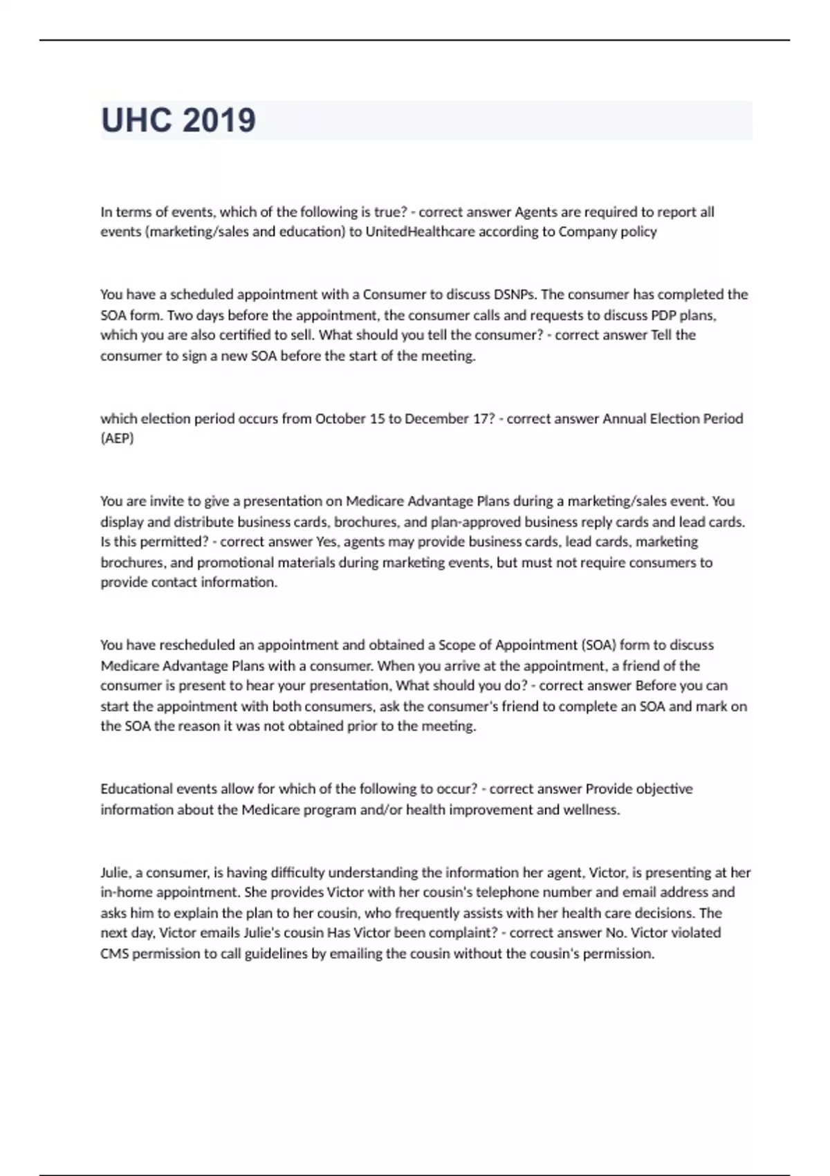 UHC 2019In terms of events, which of the following is true? - correct answer Agents are required to report all events (marketing/sales and education) to UnitedHealthcare according to Company policy You have a scheduled appointment with a Consumer to discuss DSNPs. The consumer has completed the SOA form. Two days before the appointment, the consumer calls and requests to discuss PDP plans, which you are also certified to sell. What should you tell the consumer? - correct answer Tell the consumer to sign a new SOA before the start of the meeting. which election period occurs from October 15 to December 17? - correct answer Annual Election Period (AEP) You are invite to give a presentation on Medicare Advantage Plans during a marketing/sales event. You display and distribute business cards, brochures, and plan-approved business reply cards and lead cards. Is this permitted? - correct answer Yes, agents may provide business cards, lead cards, marketing brochures, and promotional materials during marketing events, but must not require consumers to provide contact information. You have rescheduled an appointment and obtained a Scope of Appointment (SOA) form to discuss Medicare Advantage Plans with a consumer. When you arrive at the appointment, a friend of the consumer is present to hear your presentation, What should you do? - correct answer Before you can start the appointment with both consumers, ask the consumer's friend to complete an SOA and mark on the SOA the reason it was not obtained prior to the meeting. Educational events allow for which of the following to occur? - correct answer Provide objective information about the Medicare program and/or health improvement and wellness. Julie, a consumer, is having difficulty understanding the information her agent, Victor, is presenting at her in-home appointment. She provides Victor with her cousin's telephone number and email address and asks him to explain the plan to her cousin, who frequently assists with her health care decisions. The next day, Victor emails Julie's cousin Has Victor been complaint? - correct answer No. Victor violated CMS permission to call guidelines by emailing the cousin without the cousin's permission. Which of the consumers below would not likely have the authority to enroll a consumer in a Medicare Advantage Plan? - correct answer The Consumer's spouse, who is neither a Power of Attorney or legal guardian. When can telephonic contact with a Medicare eligible consumer be made? - correct answer When the consumer consented to be contacted for sales activities and subsequent telephonic contact has not yet occurred. When marketing United Healthcare Medicare plans to consumers, which of the following must an agent do? - correct answer provide current marketing materials that have been approved by the CMS and United Healthcare. In what product should agents enroll consumers? - correct answer A product that is sutable for the consumer's needs, goals and financial resources. Based on the CMS Fraud, Waste, and Abuse (FWA) training, any person who knowingly submits false claims to the Government is liable for _____ times the Government's damages caused by the violator plus a penalty - correct answer Three Based on the CMS Fraud, Waste, and Abuse (FWA) training, which of the issues below should be reported to a Compliance Department? (Select 3) - correct answer -Unethical behavior/employee misconduct. -Suspected Fraud, Waste, and Abuse (FWA). -Potential health privacy violation. Providing objective information about the Medicare program and/or health improvement and wellness at public venues is the purpose of which of the following? - correct answer Educational events. How should agent Erin respond when consumer Mrs. Rose notices that the presented MA Plan has a Star Rating of 2 Stars? - correct answer Erin should tell Mrs. Rose that the plan has received a "Below Average" rating.
