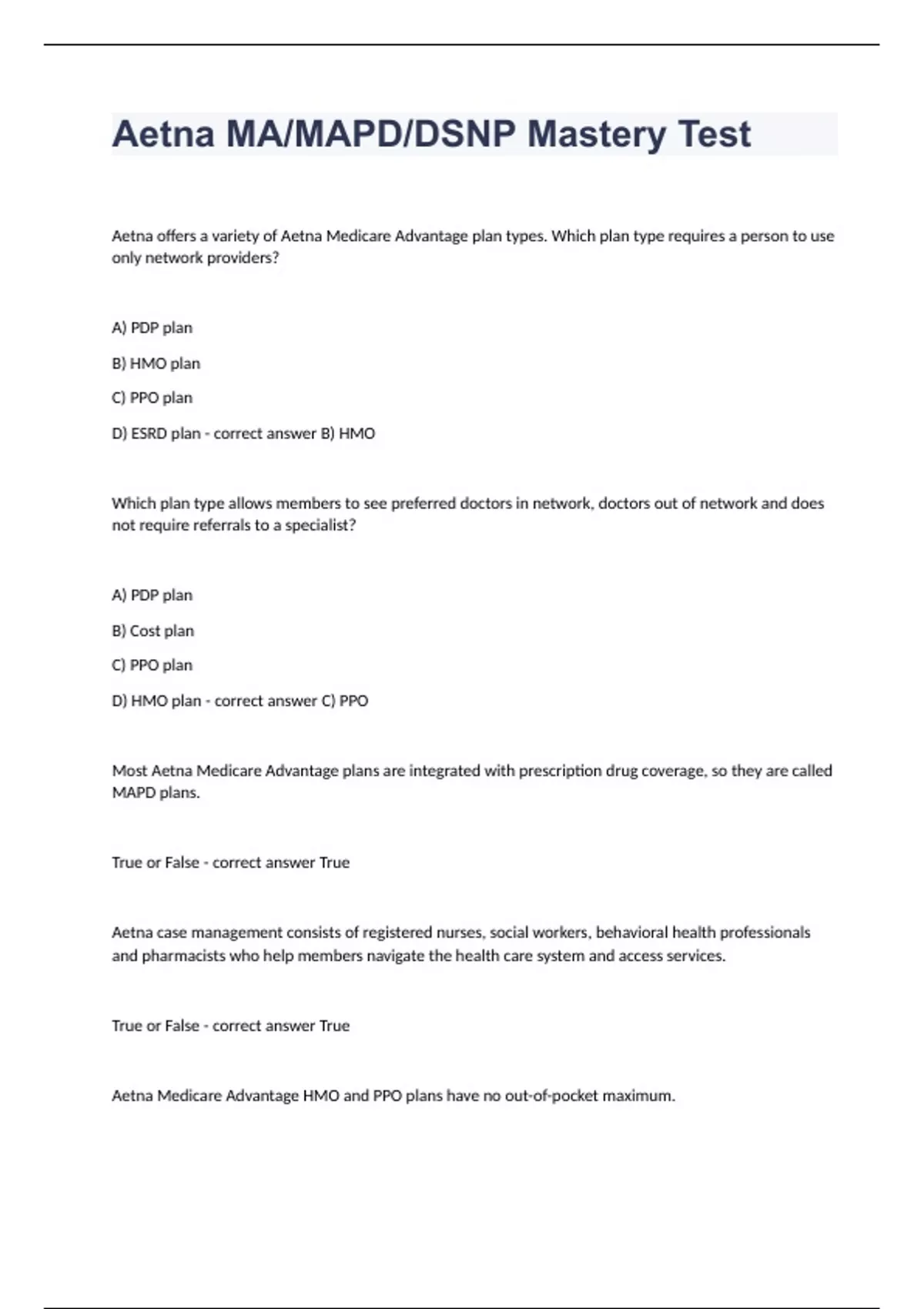 Aetna MA MAPD DSNP Mastery TestAetna offers a variety of Aetna Medicare Advantage plan types. Which plan type requires a person to use only network providers? A) PDP plan B) HMO plan C) PPO plan D) ESRD plan - correct answer B) HMO Which plan type allows members to see preferred doctors in network, doctors out of network and does not require referrals to a specialist? A) PDP plan B) Cost plan C) PPO plan D) HMO plan - correct answer C) PPO Most Aetna Medicare Advantage plans are integrated with prescription drug coverage, so they are called MAPD plans. True or False - correct answer True Aetna case management consists of registered nurses, social workers, behavioral health professionals and pharmacists who help members navigate the health care system and access services. True or False - correct answer True Aetna Medicare Advantage HMO and PPO plans have no out-of-pocket maximum. True or False - correct answer False Aetna Medicare Advantage HMO and PPO plans cover routine preventative care including an annual wellness visit, screening mammograms, and prostate cancer screenings. True or False - correct answer True A member's cost share at a preferred pharmacy will usually be lower than cost share at a standard pharmacy. True or False - correct answer True All MAPD plans have a prescription drug component. True or False - correct answer True Which of the following are true? A) The PPO plans provide access to services from doctors in the PPO network at a lower out-of-pocket cost. B) In the Open Access HMO plan, members can go to any Aetna Medicare Plan HMO network doctor they choose for covered services without a PCP referral as long as the doctor is a contracted HMO doctor. C) All of the Medicare Advantage plans include free monthly fitness club memberships to any facility participating within the SilverSneakers network. D) All of the above - correct answer D) All of the above You can find a quick list of tools for Aetna Medicare plans on