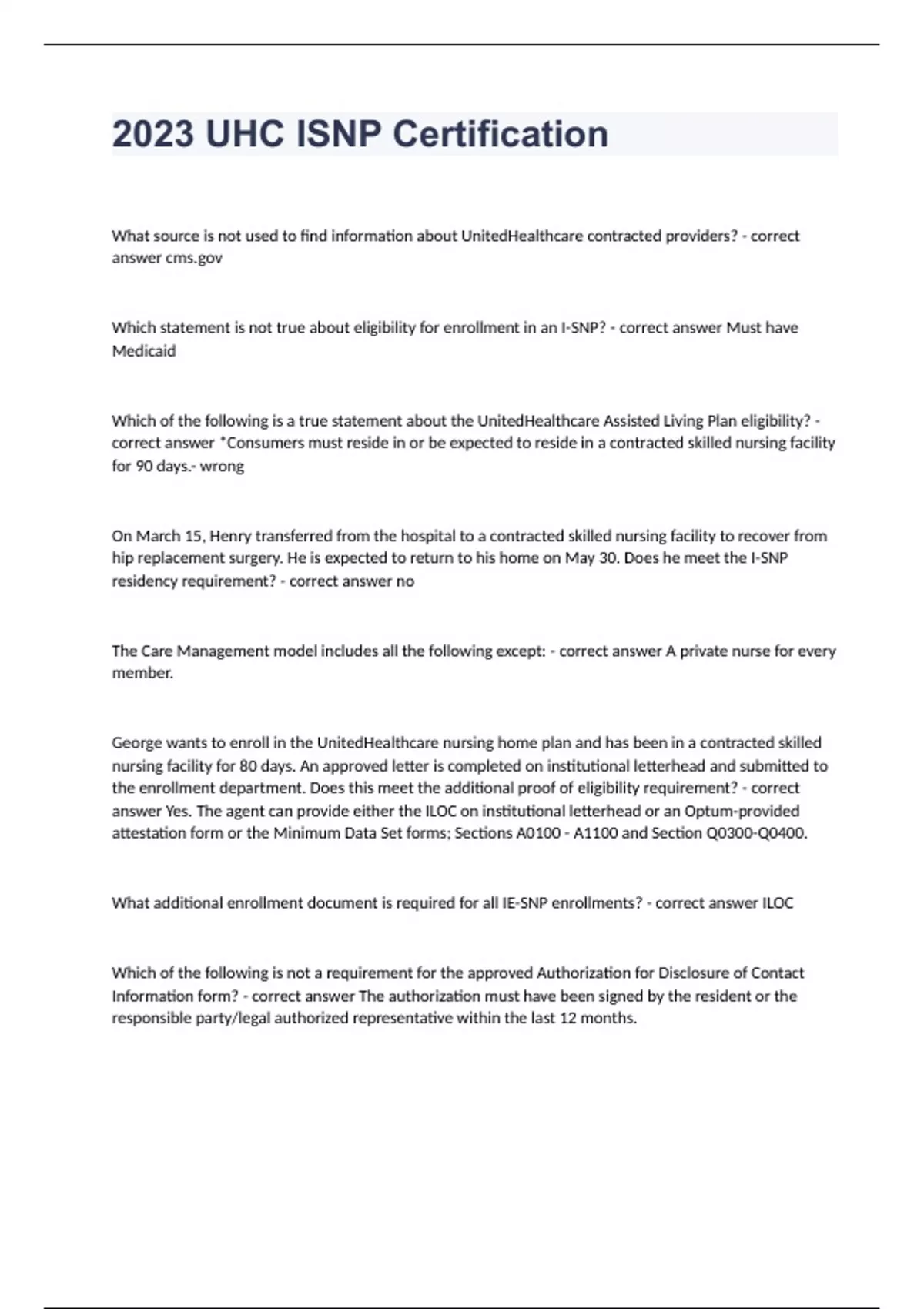 2023 UHC ISNP CertificationWhat source is not used to find information about UnitedHealthcare contracted providers? - correct answer Which statement is not true about eligibility for enrollment in an I-SNP? - correct answer Must have Medicaid Which of the following is a true statement about the UnitedHealthcare Assisted Living Plan eligibility? - correct answer *Consumers must reside in or be expected to reside in a contracted skilled nursing facility for 90 days.- wrong On March 15, Henry transferred from the hospital to a contracted skilled nursing facility to recover from hip replacement surgery. He is expected to return to his home on May 30. Does he meet the I-SNP residency requirement? - correct answer no The Care Management model includes all the following except: - correct answer A private nurse for every member. George wants to enroll in the UnitedHealthcare nursing home plan and has been in a contracted skilled nursing facility for 80 days. An approved letter is completed on institutional letterhead and submitted to the enrollment department. Does this meet the additional proof of eligibility requirement? - correct answer Yes. The agent can provide either the ILOC on institutional letterhead or an Optum-provided attestation form or the Minimum Data Set forms; Sections A0100 - A1100 and Section Q0300-Q0400. What additional enrollment document is required for all IE-SNP enrollments? - correct answer ILOC Which of the following is not a requirement for the approved Authorization for Disclosure of Contact Information form? - correct answer The authorization must have been signed by the resident or the responsible party/legal authorized representative within the last 12 months. The authorization must specifically state that a representative from a contracted health