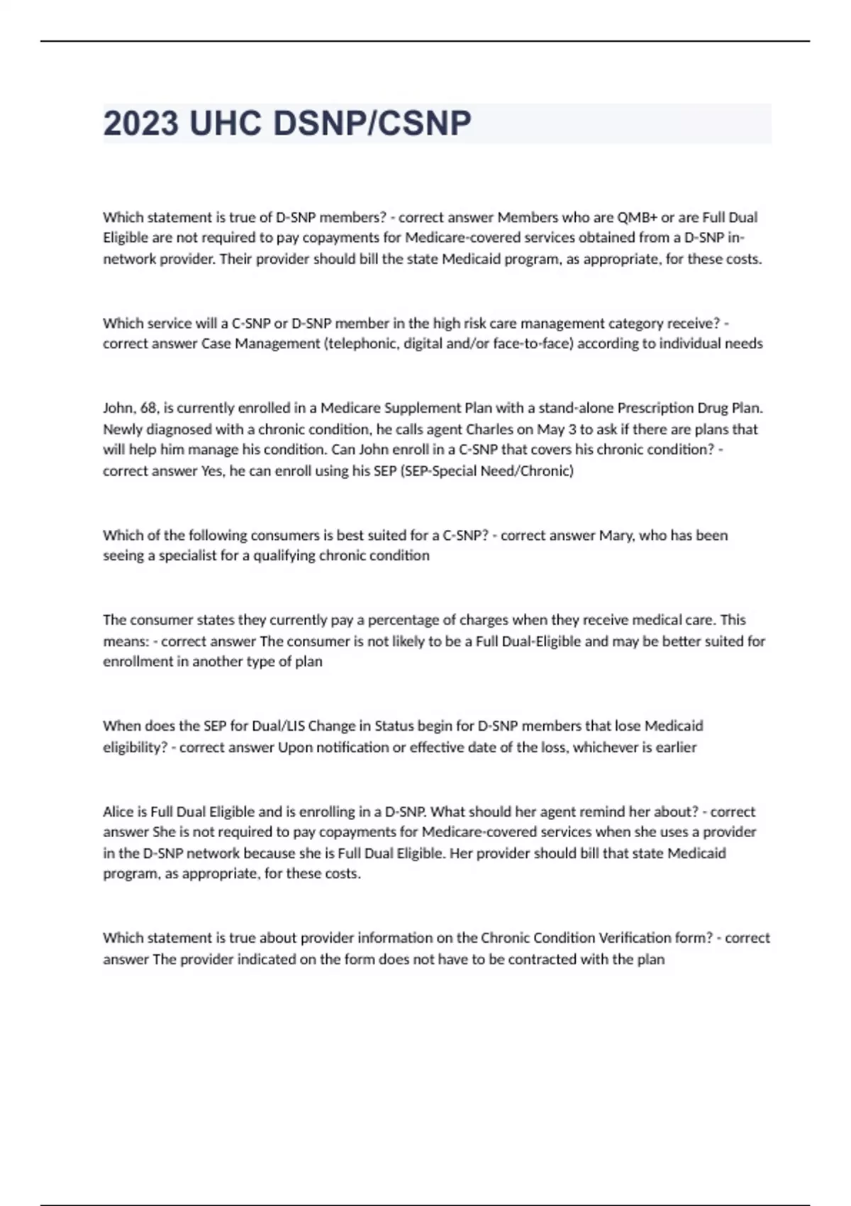 2023 UHC DSNP CSNPWhich statement is true of D-SNP members? - correct answer Members who are QMB+ or are Full Dual Eligible are not required to pay copayments for Medicare-covered services obtained from a D-SNP in-network provider. Their provider should bill the state Medicaid program, as appropriate, for these costs. Which service will a C-SNP or D-SNP member in the high risk care management category receive? - correct answer Case Management (telephonic, digital and/or face-to-face) according to individual needs John, 68, is currently enrolled in a Medicare Supplement Plan with a stand-alone Prescription Drug Plan. Newly diagnosed with a chronic condition, he calls agent Charles on May 3 to ask if there are plans that will help him manage his condition. Can John enroll in a C-SNP that covers his chronic condition? - correct answer Yes, he can enroll using his SEP (SEP-Special Need/Chronic) Which of the following consumers is best suited for a C-SNP? - correct answer Mary, who has been seeing a specialist for a qualifying chronic condition The consumer states they currently pay a percentage of charges when they receive medical care. This means: - correct answer The consumer is not likely to be a Full Dual-Eligible and may be better suited for enrollment in another type of plan When does the SEP for Dual/LIS Change in Status begin for D-SNP members that lose Medicaid eligibility? - correct answer Upon notification or effective date of the loss, whichever is earlier Alice is Full Dual Eligible and is enrolling in a D-SNP. What should her agent remind her about? - correct answer She is not required to pay copayments for Medicare-covered services when she uses a provider in the D-SNP network because she is Full Dual Eligible. Her provider should bill that state Medicaid program, as appropriate, for these costs. Which statement is true about provider information on the Chronic Condition Verification form? - correct answer The provider indicated on the form does not have to be contracted with the plan