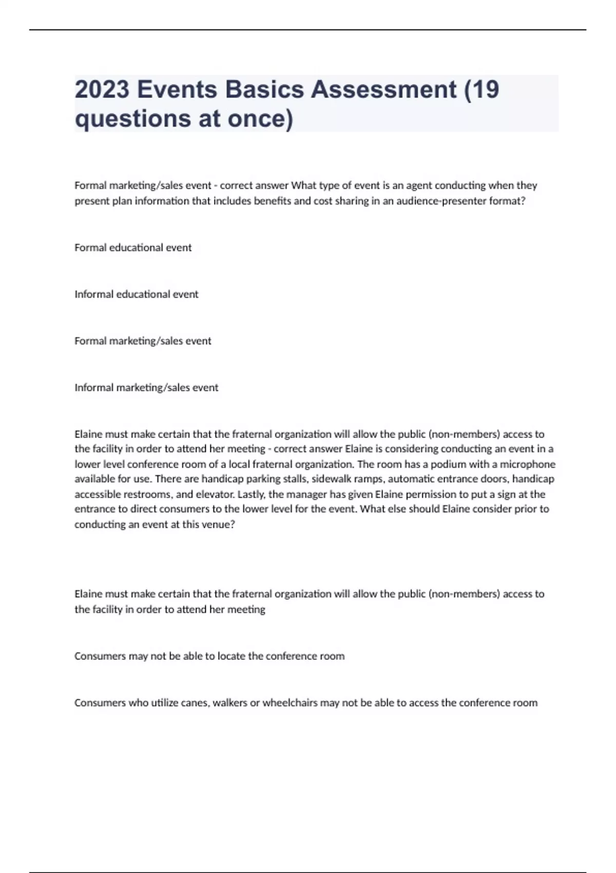 2023 Events Basics Assessment (19 questions at once).Formal marketing/sales event - correct answer What type of event is an agent conducting when they present plan information that includes benefits and cost sharing in an audience-presenter format? Formal educational event Informal educational event Formal marketing/sales event Informal marketing/sales event Elaine must make certain that the fraternal organization will allow the public (non-members) access to the facility in order to attend her meeting - correct answer Elaine is considering conducting an event in a lower level conference room of a local fraternal organization. The room has a podium with a microphone available for use. There are handicap parking stalls, sidewalk ramps, automatic entrance doors, handicap accessible restrooms, and elevator. Lastly, the manager has given Elaine permission to put a sign at the entrance to direct consumers to the lower level for the event. What else should Elaine consider prior to conducting an event at this venue? Elaine must make certain that the fraternal organization will allow the public (non-members) access to the facility in order to attend her meeting Consumers may not be able to locate the conference room Consumers who utilize canes, walkers or wheelchairs may not be able to access the conference room It needs to be reported to UnitedHealthcare prior to advertising and not less than 7 calendar days prior to the date of the event - correct answer Which of the following does not describe a personal/individual marketing appointment? It needs to be reported to UnitedHealthcare prior to advertising and not less than 7 calendar days prior to the date of the event It must not be characterized as educational It may take place in the consumer's home It is always considered marketing/sales Prior to advertising and not less than 7 calendar days prior to the event - correct answer According to UnitedHealthcare policy, when must a marketing/sales event be reported to UnitedHealthcare? Prior to advertising and not less than 3 business days prior to the event Prior to advertising and not less than 7 calendar days prior to the event Prior to advertising the event Prior to advertising and not less than 14 calendar days prior to the event Jeff is prohibited from canceling the event because it is within 1 business day and is not due to inclement weather. Jeff must hold his event or he could work with his manager to get a replacement to conduct the event. - correct answer Jeff has an informal marketing/sales event scheduled this afternoon, but a consumer has requested an in-home appointment during that time. He would like to cancel or reschedule the event because he is certain to get an enrollment application at the appointment. Which of the statements below is correct about Jeff's event?