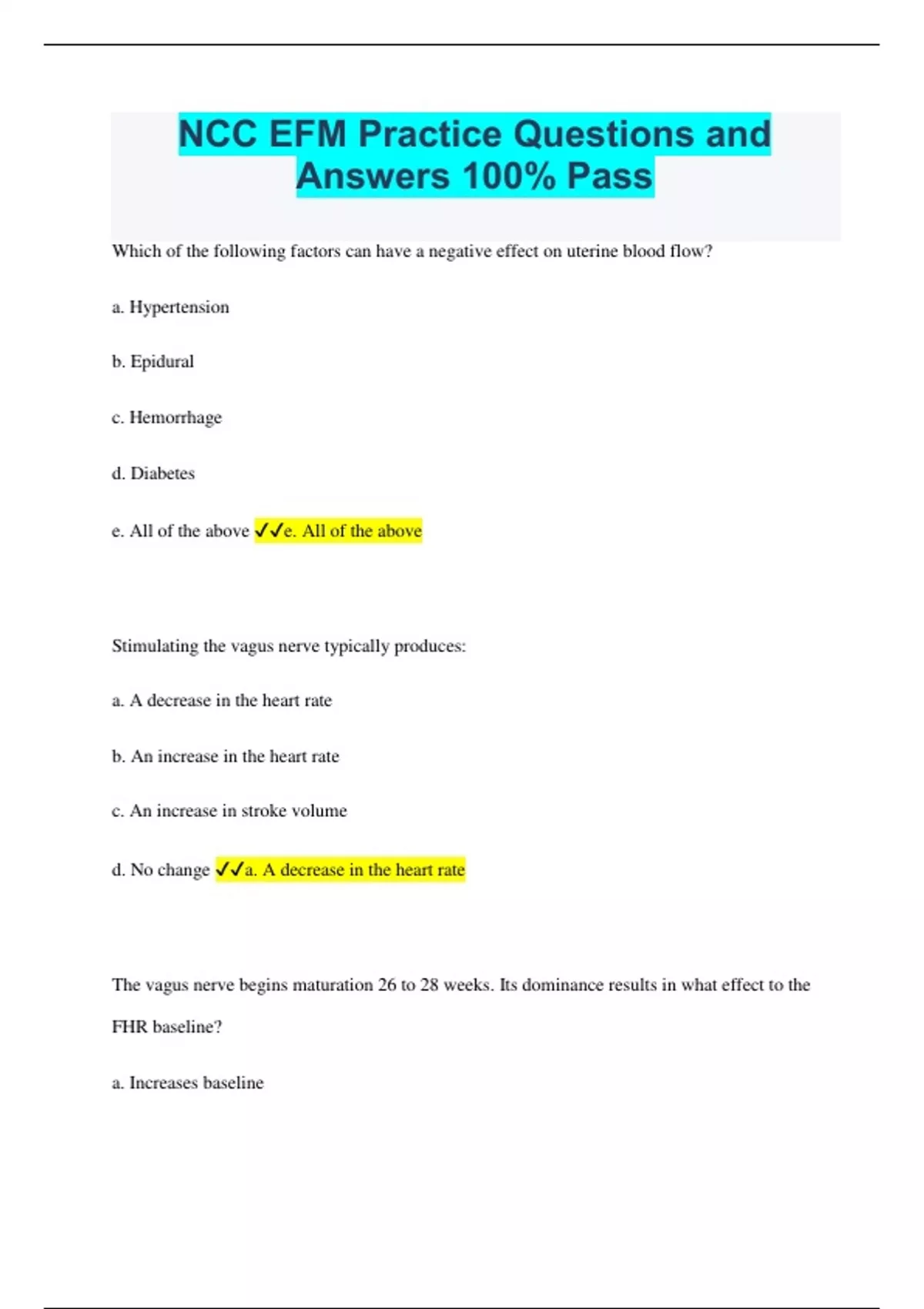 Which of the following factors can have a negative effect on uterine blood flow? a. Hypertension b. Epidural c. Hemorrhage d. Diabetes e. All of the above e. All of the above Stimulating the vagus nerve typically produces: a. A decrease in the heart rate b. An increase in the heart rate c. An increase in stroke volume d. No change a. A decrease in the heart rate
