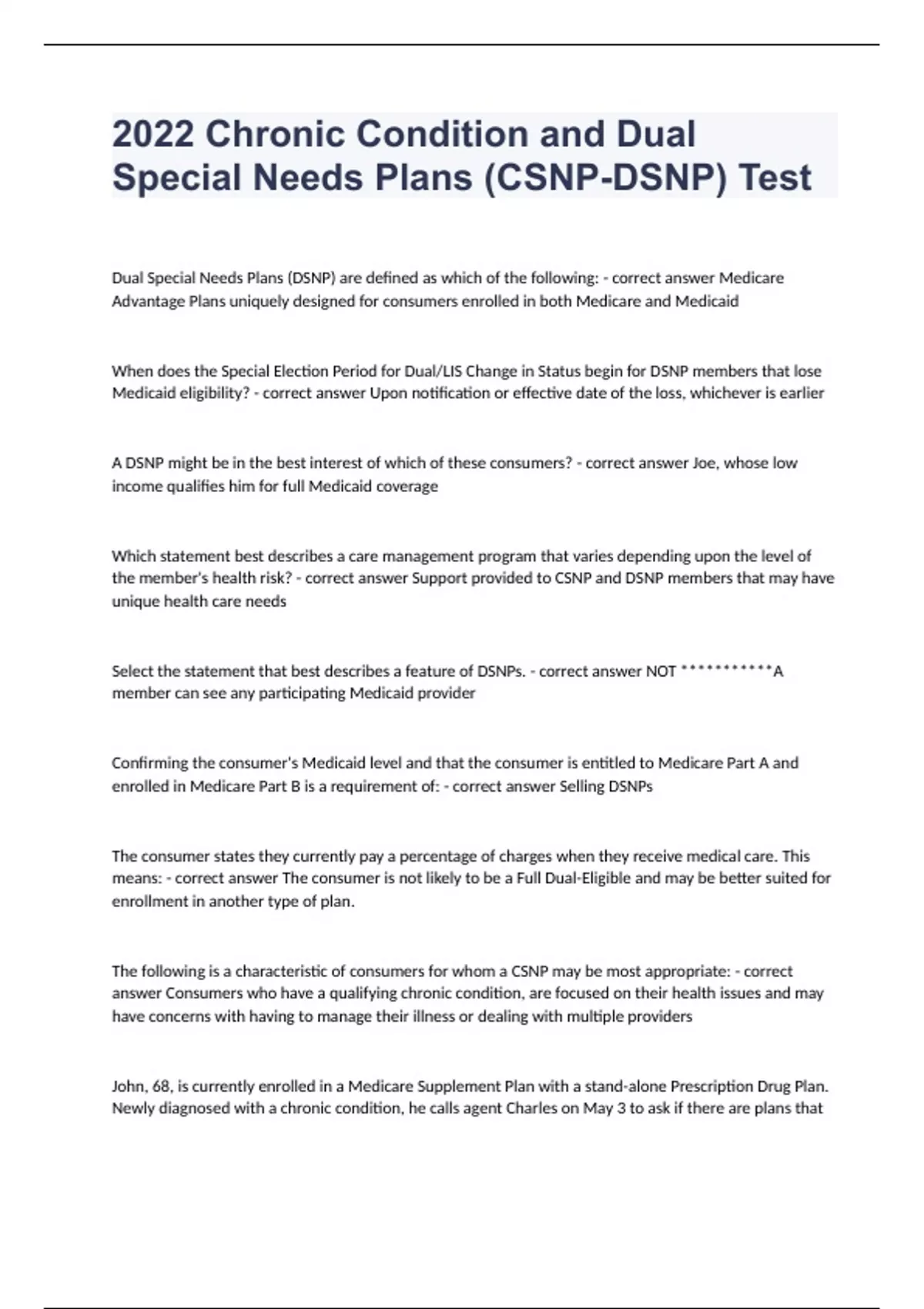 2022 Chronic Condition and Dual Special Needs Plans (CSNP-DSNP) Test Dual Special Needs Plans (DSNP) are defined as which of the following: - correct answer Medicare Advantage Plans uniquely designed for consumers enrolled in both Medicare and Medicaid When does the Special Election Period for Dual/LIS Change in Status begin for DSNP members that lose Medicaid eligibility? - correct answer Upon notification or effective date of the loss, whichever is earlier A DSNP might be in the best interest of which of these consumers? - correct answer Joe, whose low income qualifies him for full Medicaid coverage Which statement best describes a care management program that varies depending upon the level of the member's health risk? - correct answer Support provided to CSNP and DSNP members that may have unique health care needs Select the statement that best describes a feature of DSNPs. - correct answer NOT ***********A member can see any participating Medicaid provider Confirming the consumer's Medicaid level and that the consumer is entitled to Medicare Part A and enrolled in Medicare Part B is a requirement of: - correct answer Selling DSNPs The consumer states they currently pay a percentage of charges when they receive medical care. This means: - correct answer The consumer is not likely to be a Full Dual-Eligible and may be better suited for enrollment in another type of plan. The following is a characteristic of consumers for whom a CSNP may be most appropriate: - correct answer Consumers who have a qualifying chronic condition, are focused on their health issues and may have concerns with having to manage their illness or dealing with multiple providers John, 68, is currently enrolled in a Medicare Supplement Plan with a stand-alone Prescription Drug Plan. Newly diagnosed with a chronic condition, he calls agent Charles on May 3 to ask if there are plans that will help him manage his condition. Can John enroll in a Chronic Special Needs Plan (CSNP) that covers his chronic condition? - correct answer Yes, he can enroll using his Special Election Period (SEP-Special Need/Chronic) How is a CSNP or DSNP member's care management health risk levels determined initially? - correct answer The member completes a Health Assessment that asks a series of questions about their health status and assistance they may need with activities of daily living. What is the purpose of the Chronic Condition Verification form? - correct answer It authorizes the plan to contact the provider identified on the form in order to verify that the consumer has at least one of the qualifying chronic conditions covered by the CSNP. Which statement is true about the Medicaid program? - correct answer Benefits vary from state to state. You must advise consumers enrolling in a DSNP that: - correct answer They are not required to pay copayments for Medicare-covered services received from a DSNP network provider if they are Full Dual-Eligible or determined DSNP eligible by our plan agreement with the state in which they reside. Their provider should bill the state Medicaid program. Using the post-enrollment method, when will a new member be disenrolled from their CSNP if a qualifying condition cannot be verified? - correct answer At the end of the second month of enrollment A DSNP member loses his eligibility due to a change or loss of Medicaid status. What cost sharing is he responsible for while in the grace period? - correct answer All, such as premiums, deductibles, copayments, and coinsurance What program is available to support CSNP and DSNP members who may have unique health care needs? - correct answer A care management program that varies depending upon the level of the member's health risk level Which statement best describes a DSNP? - correct answer The monthly premium is at or below the Low Income Subsidy benchmark to cover drug costs