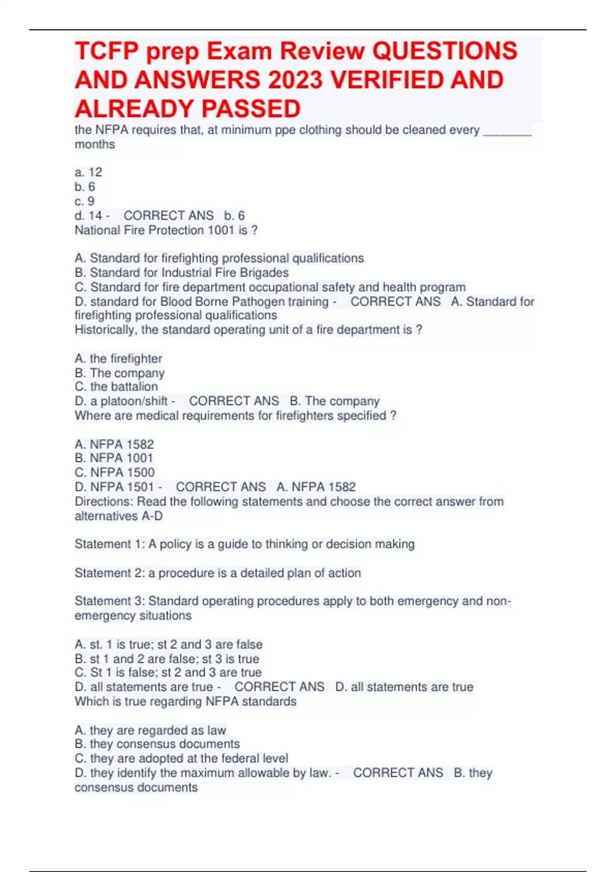 the NFPA requires that, at minimum ppe clothing should be cleaned every _______ months a. 12 b. 6 c. 9 d. 14 - CORRECT ANS b. 6 National Fire Protection 1001 is ? A. Standard for firefighting professional qualifications B. Standard for Industrial Fire Brigades C. Standard for fire department occupational safety and health program D. standard for Blood Borne Pathogen training - CORRECT ANS A. Standard for firefighting professional qualifications Historically, the standard operating unit of a fire department is ? A. the firefighter B. The company C. the battalion D. a platoon/shift - CORRECT ANS B. The company Where are medical requirements for firefighters specified ? A. NFPA 1582 B. NFPA 1001 C. NFPA 1500 D. NFPA 1501 - CORRECT ANS A. NFPA 1582 Directions: Read the following statements and choose the correct answer from alternatives A-D Statement 1: A policy is a guide to thinking or decision making Statement 2: a procedure is a detailed plan of action Statement 3: Standard operating procedures apply to both emergency and nonemergency situations A. st. 1 is true; st 2 and 3 are false B. st 1 and 2 are false; st 3 is true C. St 1 is false; st 2 and 3 are true D. all statements are true - CORRECT ANS D. all statements are true Which is true regarding NFPA standards A. they are regarded as law B. they consensus documents C. they are adopted at the federal level D. they identify the maximum allowable by law. - CORRECT ANS B. they consensus documents TCFP