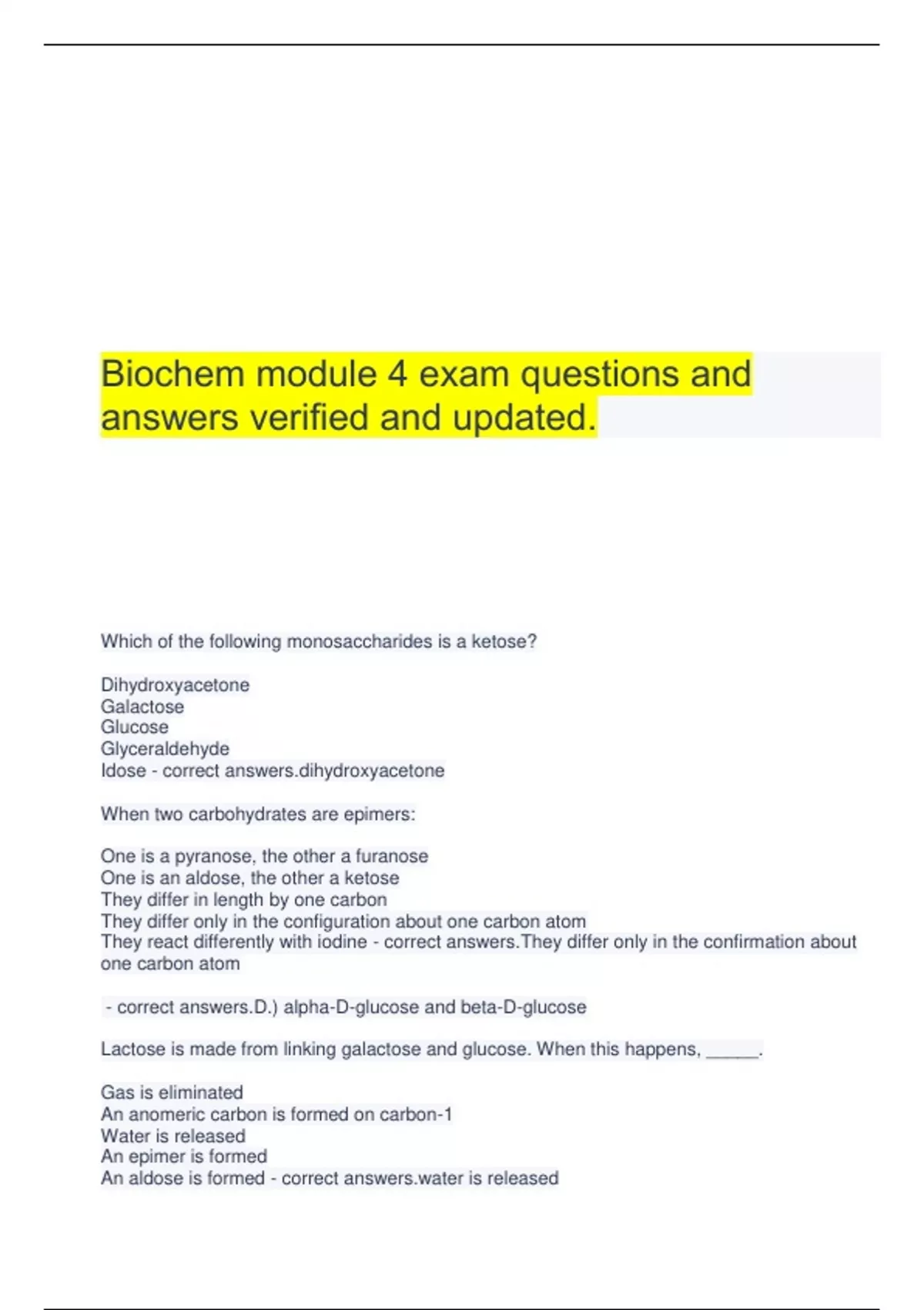 Biochem module 4 exam questions and answers verified and updated. Which of the following monosaccharides is a ketose? Dihydroxyacetone Galactose Glucose Glyceraldehyde Idose - correct roxyacetone When two carbohydrates are epimers: One is a pyranose, the other a furanose One is an aldose, the other a ketose They differ in length by one carbon They differ only in the configuration about one carbon atom They react differently with iodine - correct answers.They differ only in the confirmation about one carbon atom - correct answers.D.) alpha-D-glucose and beta-D-glucose Lactose is made from linking galactose and glucose. When this happens, _____. Gas is eliminated An anomeric carbon is formed on carbon-1 Water is released An epimer is formed An aldose is formed - correct is released Amylose and amylopectin are both polymers of: A) α-D-glucose B) β-D-glucose C) Galactose D) Idose E) Maltose - correct answers.A.) alpha-D-glucose Which statement about starch and glycogen is false? A) Both have β-D-glucose monomers B) Both starch and glycogen are energy storage polysaccharides C) Both are homopolymers of glucose D) Glycogen is more extensively branched than starch E) Both have O-glycosidic linkages - correct answers.A.) both have beta-D-Glucose monomers Which monosaccharide is not a six-carbon monosaccharide? Fructose Ribose Mannose Galactose Glucose - correct e The two monosaccharides shown below could best be described as: Anomers Aldoses Ketoses Epimers Pentoses - correct rs Which arrow correctly identifies the atom that will become the anomeric carbon? - correct answers.The first carbon at the top of the Fischer structure Based on the form of the cyclic sugar below in a Haworth projection, which Fischer projection formula could have formed this structure? - correct at the hawthorn projection and create Fischer projections for it The following monosaccharides are covalently bonded. What type of bond unites them? - correct 1->6 vertical and through the downward pointing OH group off of carbon 1 1-4 is just side by side Which statement about cellulose is true? Cellulose is the primary storage polysaccharide of animal cells Cellulose is a highly branched polysaccharide Cellulose is a homopolysaccharide The glucose residues of cellulose contain the same configuration as the glucose residues of amylose Cellulose is an anomer of chitin - correct lose is a homopolysaccharide The polysaccharide cellulose is most chemically similar to: Glycogen Dextrose Glycogen Chitin Starch - correct n Which of the following is the most common monosaccharide on earth? Ribose Cellulose Chitin Sucrose Glucose - correct se The "D" in the D-carbohydrates stands for: Derivation Double Disaccharide 3-dimensional Dextrorotatory - correct orotatory Which compound does not fit the formal definition of a carbohydrate? A. C6H12O6 B. C7H10O7 C. C8H16O8 D. C3H6O3 E. C4H8O4 - correct answers.B. C7H10O7 identify the hemiacetal bond - correct des the anomeric carbon, H, OH, and O in the ring tell the difference between alpha beta and D and L configurations - correct answers.D & L: look at the penultimate carbon L=left D=right alpha and beta. Alpha is the OH on the top of the anomeric carbon Beta is under the anomeric carbon Table sugar is also known as: Sucrose Dextrose Glucose Galactose Glycogen - correct se