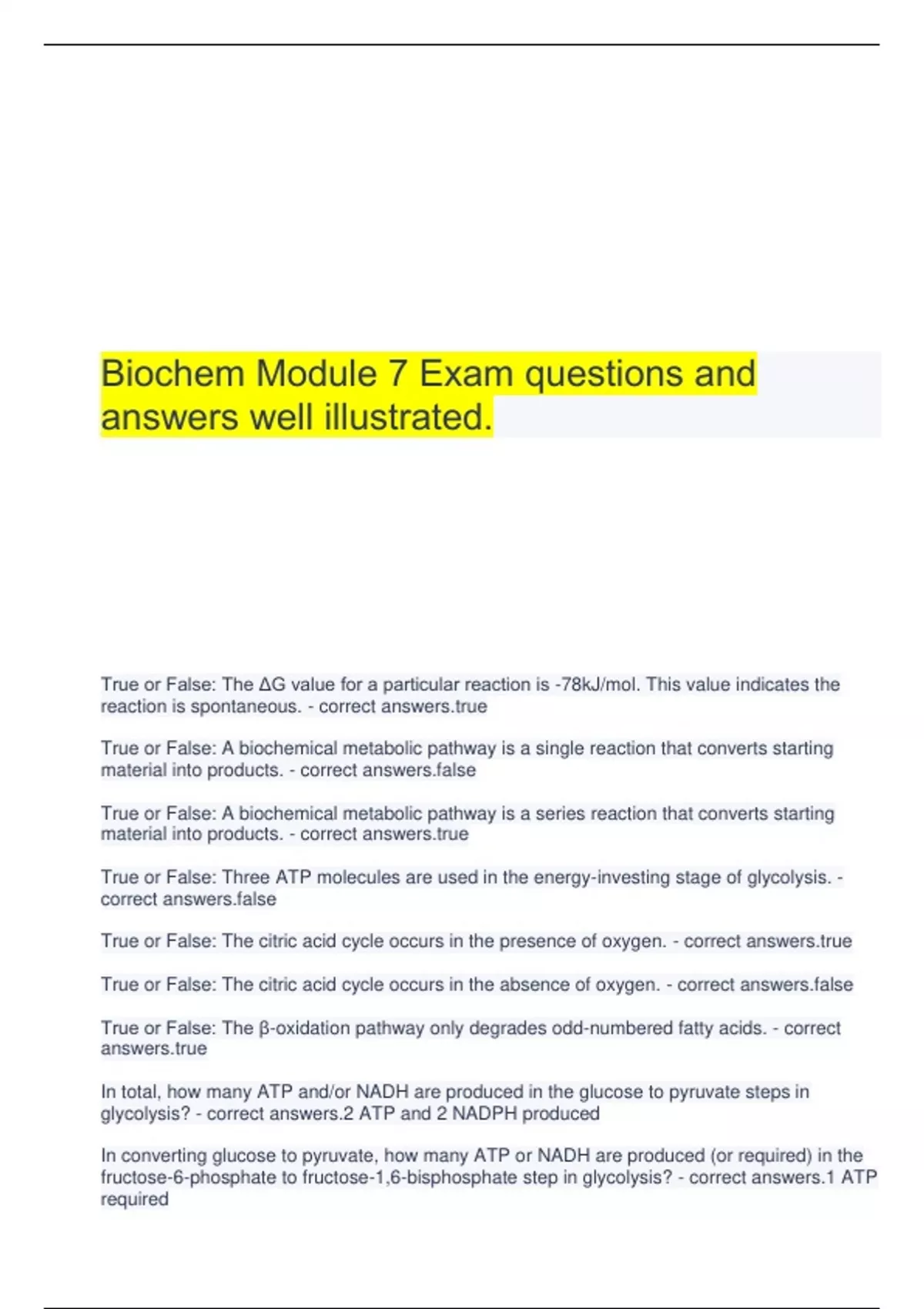 Biochem Module 7 Exam questions and answers well illustrated. True or False: The ΔG value for a particular reaction is -78kJ/mol. This value indicates the reaction is spontaneous. - correct True or False: A biochemical metabolic pathway is a single reaction that converts starting material into products. - correct True or False: A biochemical metabolic pathway is a series reaction that converts starting material into products. - correct True or False: Three ATP molecules are used in the energy-investing stage of glycolysis. - correct True or False: The citric acid cycle occurs in the presence of oxygen. - correct True or False: The citric acid cycle occurs in the absence of oxygen. - correct True or False: The β-oxidation pathway only degrades odd-numbered fatty acids. - correct In total, how many ATP and/or NADH are produced in the glucose to pyruvate steps in glycolysis? - correct answers.2 ATP and 2 NADPH produced In converting glucose to pyruvate, how many ATP or NADH are produced (or required) in the fructose-6-phosphate to fructose-1,6-bisphosphate step in glycolysis? - correct answers.1 ATP required In converting glucose to pyruvate, how many ATP or NADH are produced (or required) in the glucose to glucose-6-phosphate step in glycolysis? - correct answers.1 ATP required In converting glucose to pyruvate, how many ATP or NADH are produced (or required) in the glyceraldehyde 3-phosephate to 1,3-bisphosphoglycerate step in glycolysis? - correct answers.2 NADH produced In converting glucose to pyruvate, how many ATP or NADH are produced (or required) in the 1,3-bisphosphoglycerate to 3-phosphoglycerate step in glycolysis? - correct answers.2 ATP produced In converting glucose to pyruvate, how many ATP or NADH are produced (or required) in the phosphoenolpyruvate to pyruvate step in glycolysis? - correct answers.2 ATP produced What is the primary product of glycolysis? - correct ate In glycolysis, when glucose enters a cell, it is immediately phosphorylated to form glucose-6-phosphate. The phosphate donor in this reaction is ATP, and the enzyme is ___. - correct inase In glycolysis, when glucose enters a cell, it is immediately phosphorylated to form glucose-6- phosphate. The phosphate donor in this reaction is _______, and the enzyme is hexokinase. - correct answers.ATP In glycolysis, when fructose-6-phosphate is preparing to split the phosphate donor in this reaction is ATP, and the enzyme is ________. - correct hofructokinase-1 In the last reaction of glycolysis, ATP is formed by the direct transfer of a phosphate group from a metabolite to ADP. This process is referred to as: - correct rate-level phosphorylation Under anaerobic condition, to which compound is pyruvate converted? - correct ol or lactate The process that extracts energy as ATP but does not consume O2 or change the concentration of NAD+/NADH: - correct ntation How many reactions are in glycolysis? - correct answers.10 The reactions of glycolysis take place in/on the ___. - correct ol How is ATP used in the initial steps of glycolysis? - correct e for phosphorylation Which of the following is a cyclic pathway? a. CAC b. PDH c. glycolysis d. oxidative phosphorylation e. beta-oxidation - correct answers.a. CAC