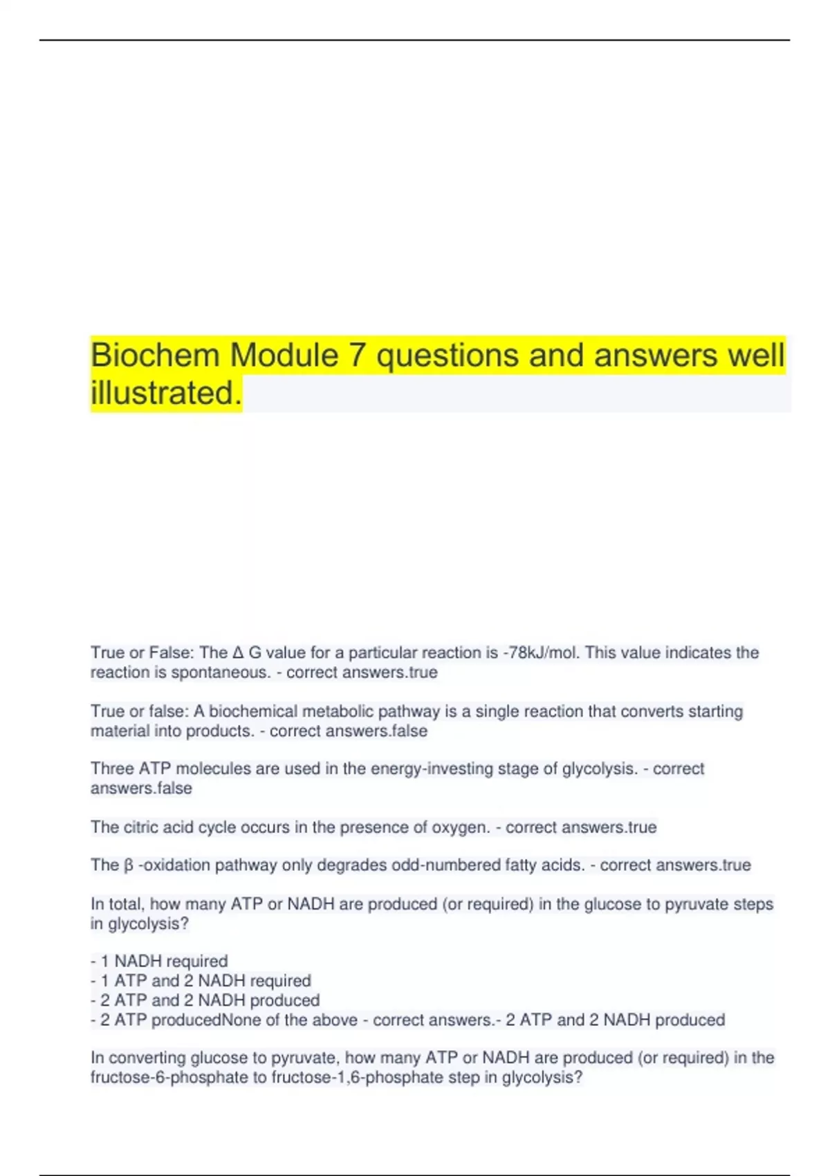 Biochem Module 7 questions and answers well illustrated. True or False: The Δ G value for a particular reaction is -78kJ/mol. This value indicates the reaction is spontaneous. - correct True or false: A biochemical metabolic pathway is a single reaction that converts starting material into products. - correct Three ATP molecules are used in the energy-investing stage of glycolysis. - correct The citric acid cycle occurs in the presence of oxygen. - correct The β -oxidation pathway only degrades odd-numbered fatty acids. - correct In total, how many ATP or NADH are produced (or required) in the glucose to pyruvate steps in glycolysis? - 1 NADH required - 1 ATP and 2 NADH required - 2 ATP and 2 NADH produced - 2 ATP producedNone of the above - correct answers.- 2 ATP and 2 NADH produced In converting glucose to pyruvate, how many ATP or NADH are produced (or required) in the fructose-6-phosphate to fructose-1,6-phosphate step in glycolysis? - 1 ATP required - 1 ATP produced - 2 ATP produced - 2 ATP required - None of the above - correct answers.- 1 ATP required What is the primary product of glycolysis? - Glucose - Glucose-6-phosphate - phosphoenolpyruvate - GAP and DHAP - Pyruvate - correct answers.- Pyruvate In glycolysis, when glucose enters a cell, it is immediately phosphorylated to form glucose-6- phosphate. The phosphate donor in this reaction is ATP, and the enzyme is ________. - Hexokinase - Aldolase - CoA - Phosphohexose isomerase - None of the above - correct answers.- Hexokinase In the last reaction of glycolysis, ATP is formed by the direct transfer of a phosphate group from a metabolite to ADP. This process is referred to as: - Substrate-level phosphorylation - Protein phosphorylation - Lipid phosphorylation - Isomerization - Photo-protein dephosphorylation - correct answers.Substrate-level phosphorylation Under anaerobic conditions, to which compound is pyruvate converted? - Ethanol - DHAP - Hexokinase - GAP - None of the above - correct answers.- Ethanol There are ___________ reactions in glycolysis. 6 8 9 10 12 - correct answers.10 The reactions of glycolysis take place in/on the ___________. - Mitochondria - Vacuoles - Ribosome - Cytosol - None of the above - correct answers.- Cytosol How is ATP used in the initial steps of glycolysis? - Lipid phosphorylation reagent - Isomerization reaction - Source for phosphorylation - Protein production - None of the above - correct answers.- Source for phosphorylation Which of the following is a cyclic pathway? CAC PDH Glycolysis Oxidative phosphorylation β -oxidation - correct answers.CAC How many ATP molecules does NADH yield after oxidative phosphorylation? 1.5 2 2.5 3 3.5 - correct answers.2.5 Besides NADH and FADH2, what energy molecule is produced directly in the citric acid cycle? A. CO2 B.ATP C. CTP D. UTP E. None of the above - correct answers.E. None of the above What molecule is missing in the following reaction? A. PDH B. Isocitrate C. Fumarate D. FADH2 E. Succinyl-CoA - correct answers.B. Isocitrate The enzymes and coenzymes of the citric acid cycle are all present in the ________. - Mitochondria - Vacuoles - Nucleus - Lysosomes - None of the above - correct answers.- Mitochondria Cellular respiration is the process of cells taking in ______ and producing ______ to generate energy.