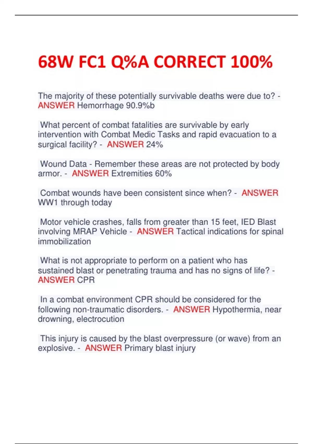 68W FC1 Q%A CORRECT 100% The majority of these potentially survivable deaths were due to? - ANSWER Hemorrhage 90.9%b What percent of combat fatalities are survivable by early intervention with Combat Medic Tasks and rapid evacuation to a surgical facility? - ANSWER 24% Wound Data - Remember these areas are not protected by body armor. - ANSWER Extremities 60% Combat wounds have been consistent since when? - ANSWER WW1 through today Motor vehicle crashes, falls from greater than 15 feet, IED Blast involving MRAP Vehicle - ANSWER Tactical indications for spinal immobilization What is not appropriate to perform on a patient who has sustained blast or penetrating trauma and has no signs of life? - ANSWER CPR In a combat environment CPR should be considered for the following non-traumatic disorders. - ANSWER Hypothermia, near drowning, electrocution This injury is caused by the blast overpressure (or wave) from an explosive. - ANSWER Primary blast injury Blast overpressure is more effective in this type of area. - ANSWER Enclosed area Inhalation burns occur with greater frequency in fires in these areas. - ANSWER Confined spaces Single most significant obstacle to the Combat medics ability to provide care. - ANSWER Enemy Fire Factors influencing care on the battlefield. - ANSWER Enemy fire, medical equipment limitations, widely variable evacuation time. Who is always in command and will decide if casualties will be evacuated? - ANSWER Tactical Leader Combat medics should use what before using their own supplies in their aid bag? - ANSWER Casualty's IFAK This contains a folding talon litter and a robust amount of first aid supplies suitable for hemorrhage control and treatment for shock. - ANSWER Warrior Aid and Litter Kit (WALK) Not every injured casualty will require what? - ANSWER Intravenous fluids Option 1 for mild to moderate pain, casualty is still able to fight - Medications on the battlefield. - ANSWER Pill Pack self administered Option 2 for moderate to severe pain, casualty is not in shock or respiratory distress. Casualty is not at significant risk of developing either condition. - ANSWER Oral Transmuccal Fentanyl Citrate (OTFC) 800 ug