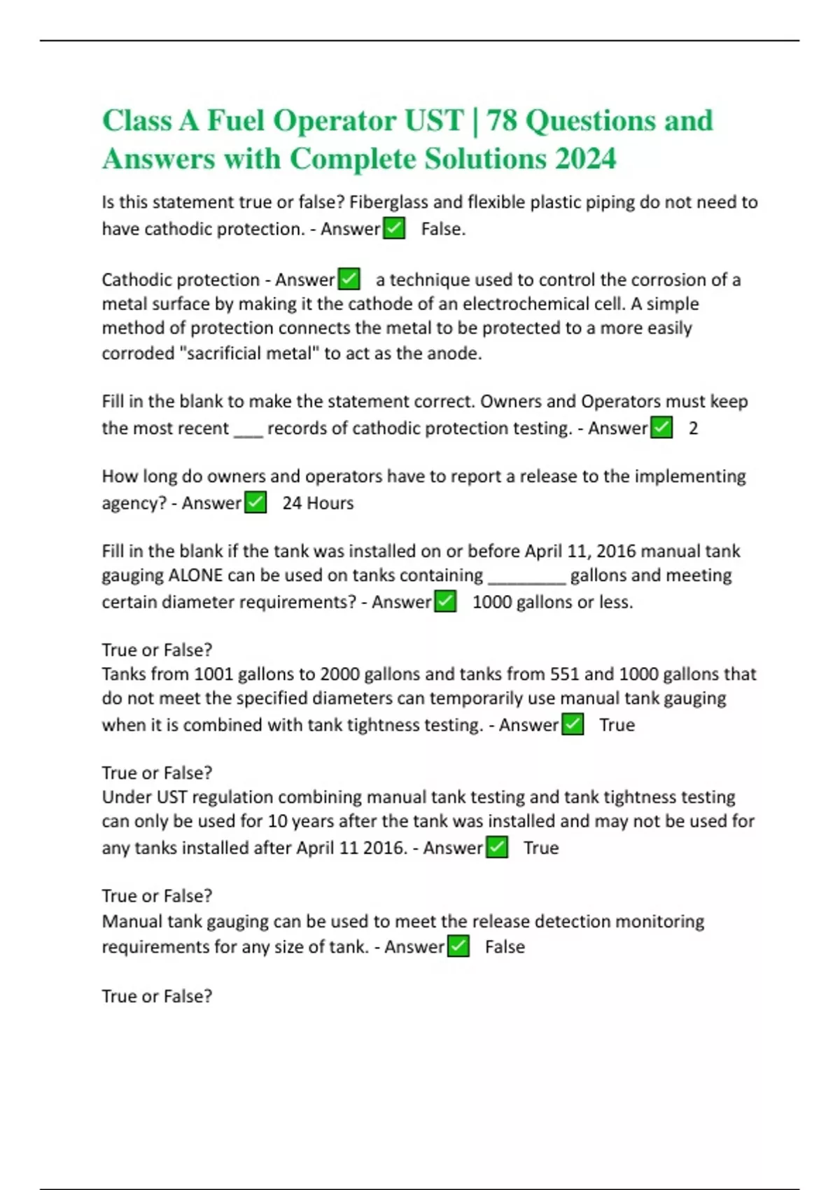 Class A Fuel Operator UST | 78 Questions and Answers with Complete Solutions 2024
