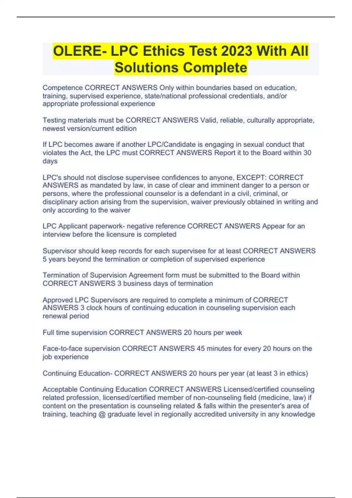 OLERE- LPC Ethics Test 2023 With All Solutions Complete