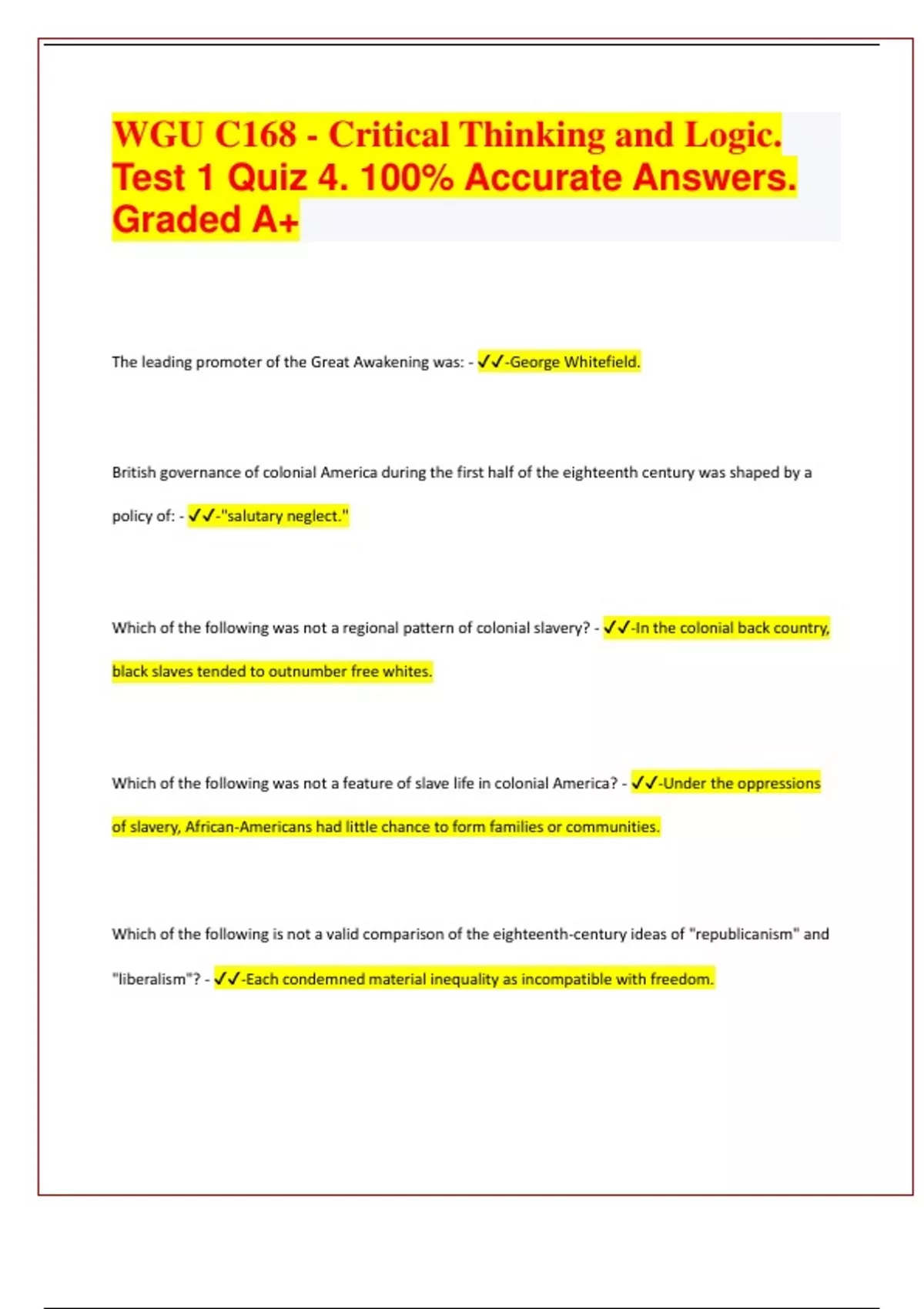 WGU C168 - Critical Thinking and Logic. Test 1 Quiz 4. 100% Accurate Answers. Graded A+ 2024