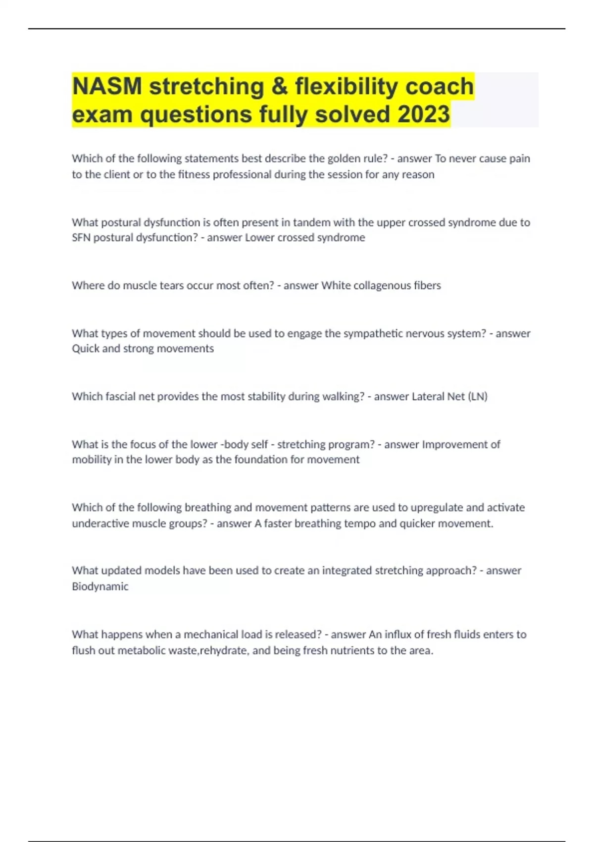 NASM stretching & flexibility coach exam questions fully solved 2023