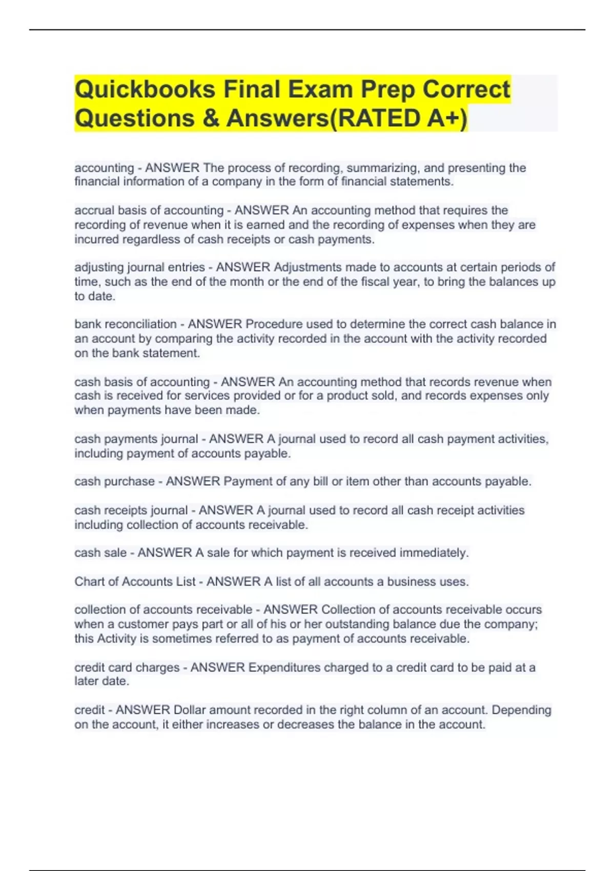 accounting - ANSWER The process of recording, summarizing, and presenting the financial information of a company in the form of financial statements. accrual basis of accounting - ANSWER An accounting method that requires the recording of revenue when it is earned and the recording of expenses when they are incurred regardless of cash receipts or cash payments. adjusting journal entries - ANSWER Adjustments made to accounts at certain periods of time, such as the end of the month or the end of the fiscal year, to bring the balances up to date. bank reconciliation - ANSWER Procedure used to determine the correct cash balance in an account by comparing the activity recorded in the account with the activity recorded on the bank statement. cash basis of accounting - ANSWER An accounting method that records revenue when cash is received for services provided or for a product sold, and records expenses only when payments have been made. cash payments journal - ANSWER A journal used to record all cash payment activities, including payment of accounts payable. cash purchase - ANSWER Payment of any bill or item other than accounts payable. cash receipts journal - ANSWER A journal used to record all cash receipt activities including collection of accounts receivable. cash sale - ANSWER A sale for which payment is received immediately. Chart of Accounts List - ANSWER A list of all accounts a business uses. collection of accounts receivable - ANSWER Collection of accounts receivable occurs when a customer pays part or all of his or her outstanding balance due the company; this Activity is sometimes referred to as payment of accounts receivable. credit card charges - ANSWER Expenditures charged to a credit card to be paid at a later date. credit - ANSWER Dollar amount recorded in the right column of an account. Depending on the account, it either increases or decreases the balance in the account.