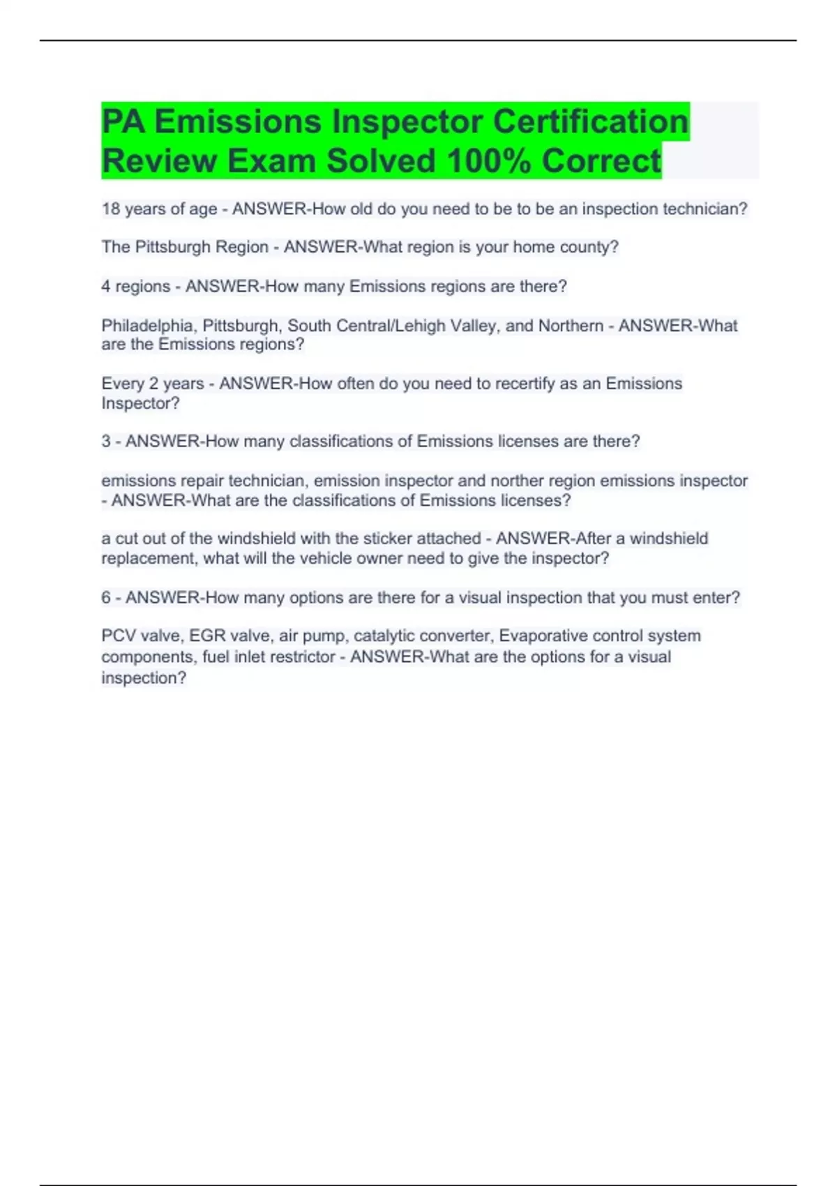 PA Emissions Inspector Certification Review Exam Solved 100% Correct
