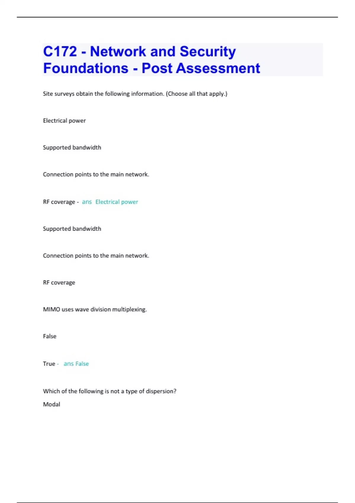 Site surveys obtain the following information. (Choose all that apply.) Electrical power Supported bandwidth Connection points to the main network. RF coverage - ans Electrical power Supported bandwidth Connection points to the main network. RF coverage MIMO uses wave division multiplexing. False True - ans False Which of the following is not a type of dispersion? ModalPolarization mode Light Chromatic - ans Light Single-mode fibers use high-power, highly directional modulated light sources. False True - ans True The port number for DNS is ____. 21 23 25 80 53 - ans 53