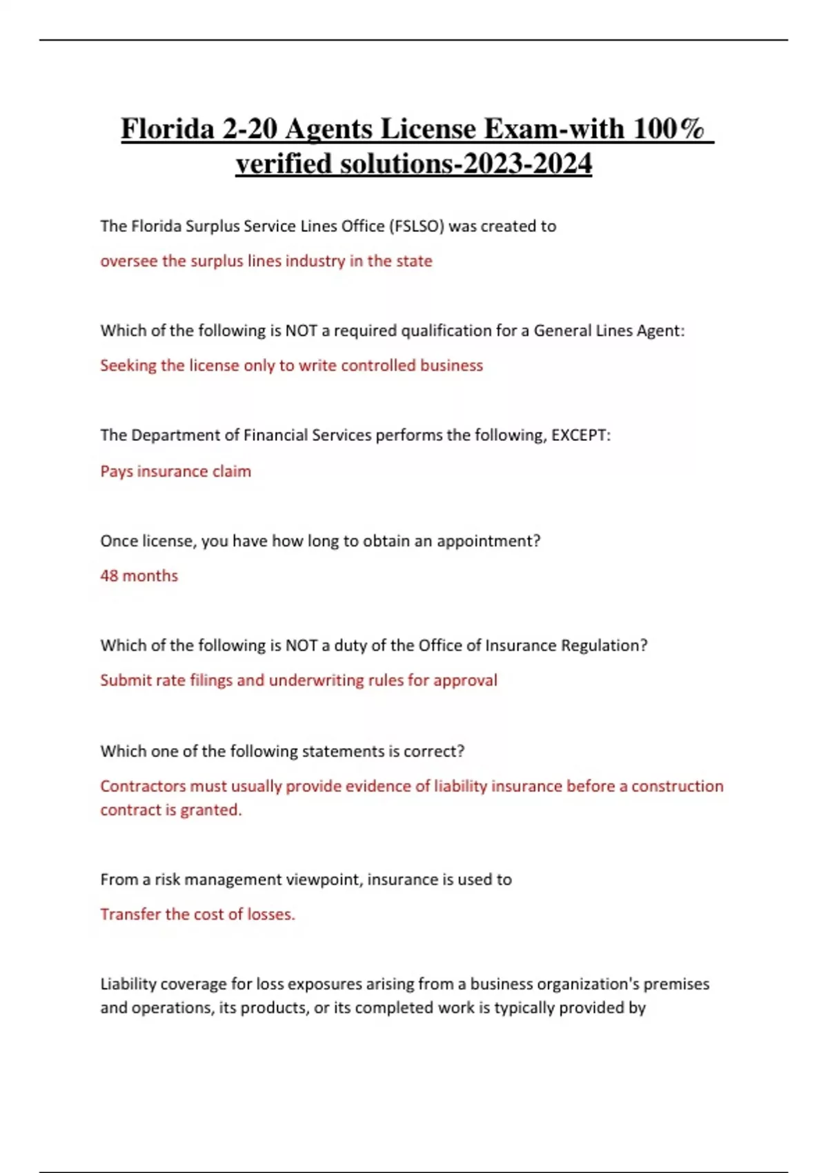 Florida 2-20 Agents License Exam-with 100% verified solutions-