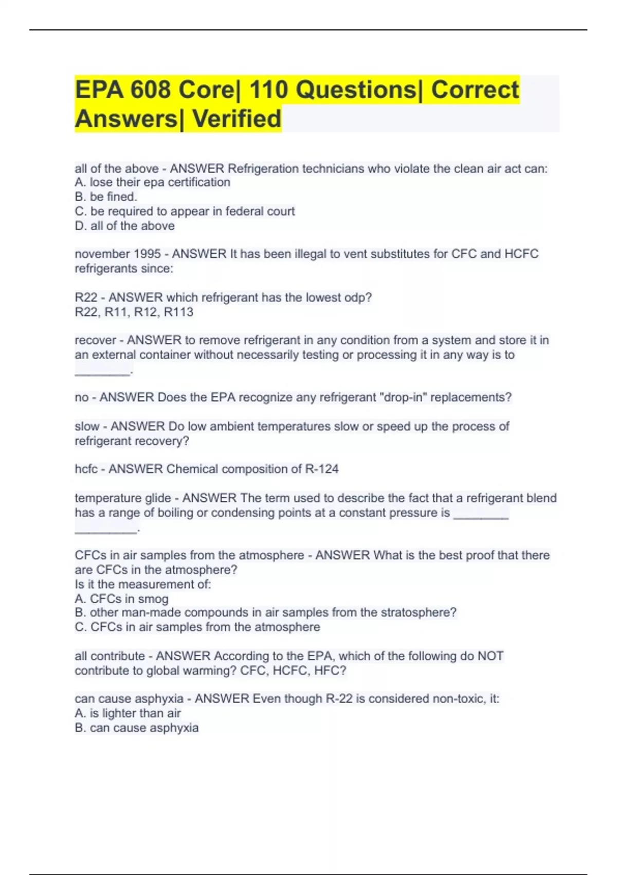 EPA 608 Core| 110 Questions| Correct Answers| Verified