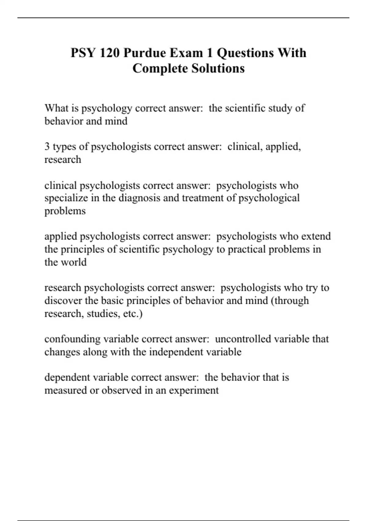 PSY 120 Purdue Exam 1 Questions With Complete Solutions