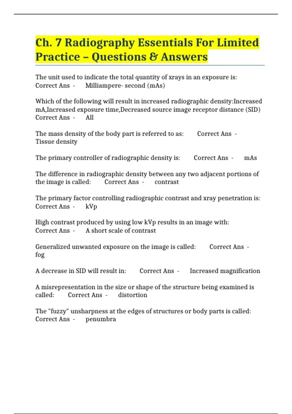 Ch. 7 Radiography Essentials For Limited Practice – Questions & Answers