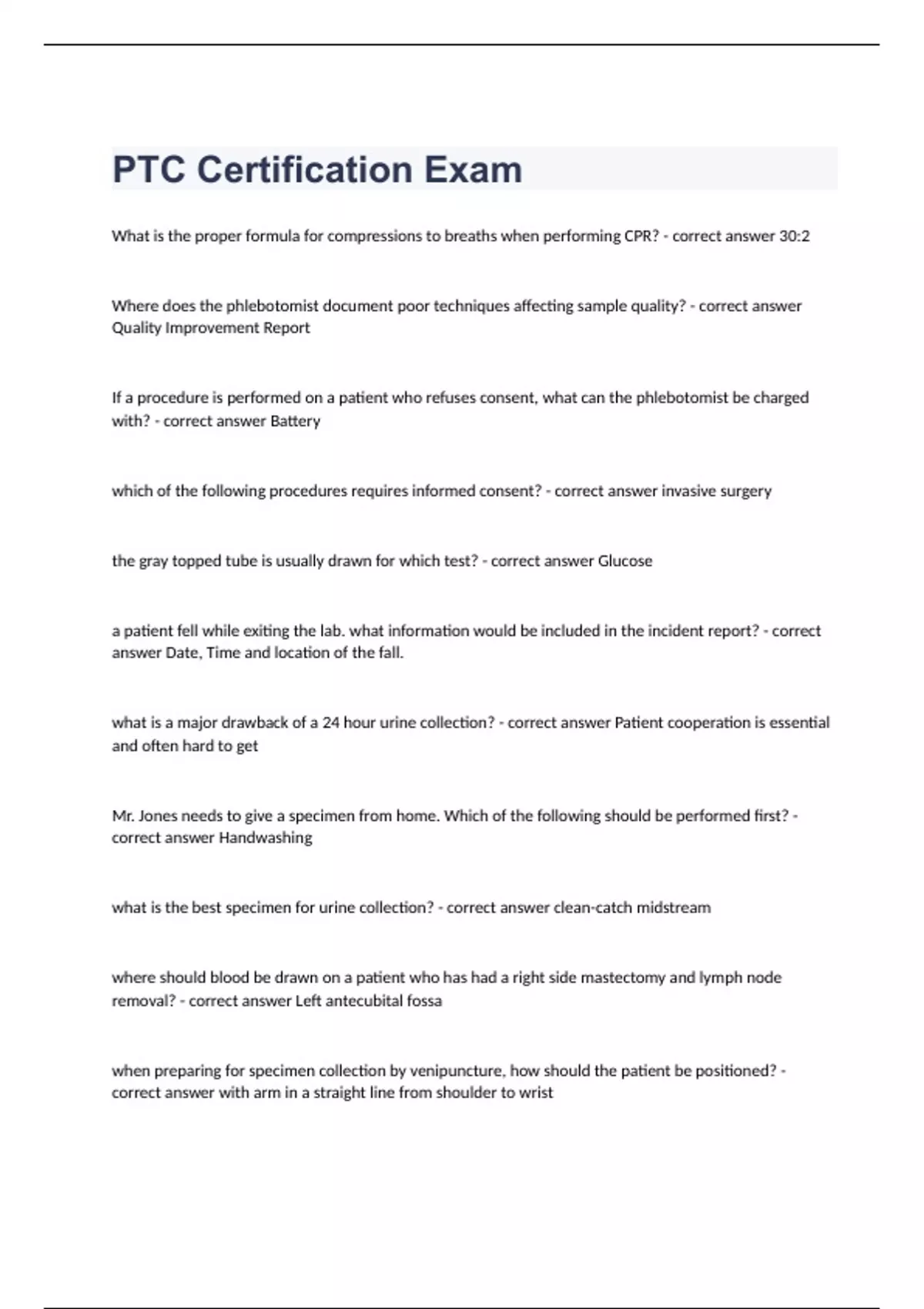 PTC Certification ExamWhat is the proper formula for compressions to breaths when performing CPR? - correct answer 30:2 Where does the phlebotomist document poor techniques affecting sample quality? - correct answer Quality Improvement Report If a procedure is performed on a patient who refuses consent, what can the phlebotomist be charged with? - correct answer Battery which of the following procedures requires informed consent? - correct answer invasive surgery the gray topped tube is usually drawn for which test? - correct answer Glucose a patient fell while exiting the lab. what information would be included in the incident report? - correct answer Date, Time and location of the fall. what is a major drawback of a 24 hour urine collection? - correct answer Patient cooperation is essential and often hard to get Mr. Jones needs to give a specimen from home. Which of the following should be performed first? - correct answer Handwashing what is the best specimen for urine collection? - correct answer clean-catch midstream where should blood be drawn on a patient who has had a right side mastectomy and lymph node removal? - correct answer Left antecubital fossa when preparing for specimen collection by venipuncture, how should the patient be positioned? - correct answer with arm in a straight line from shoulder to wrist