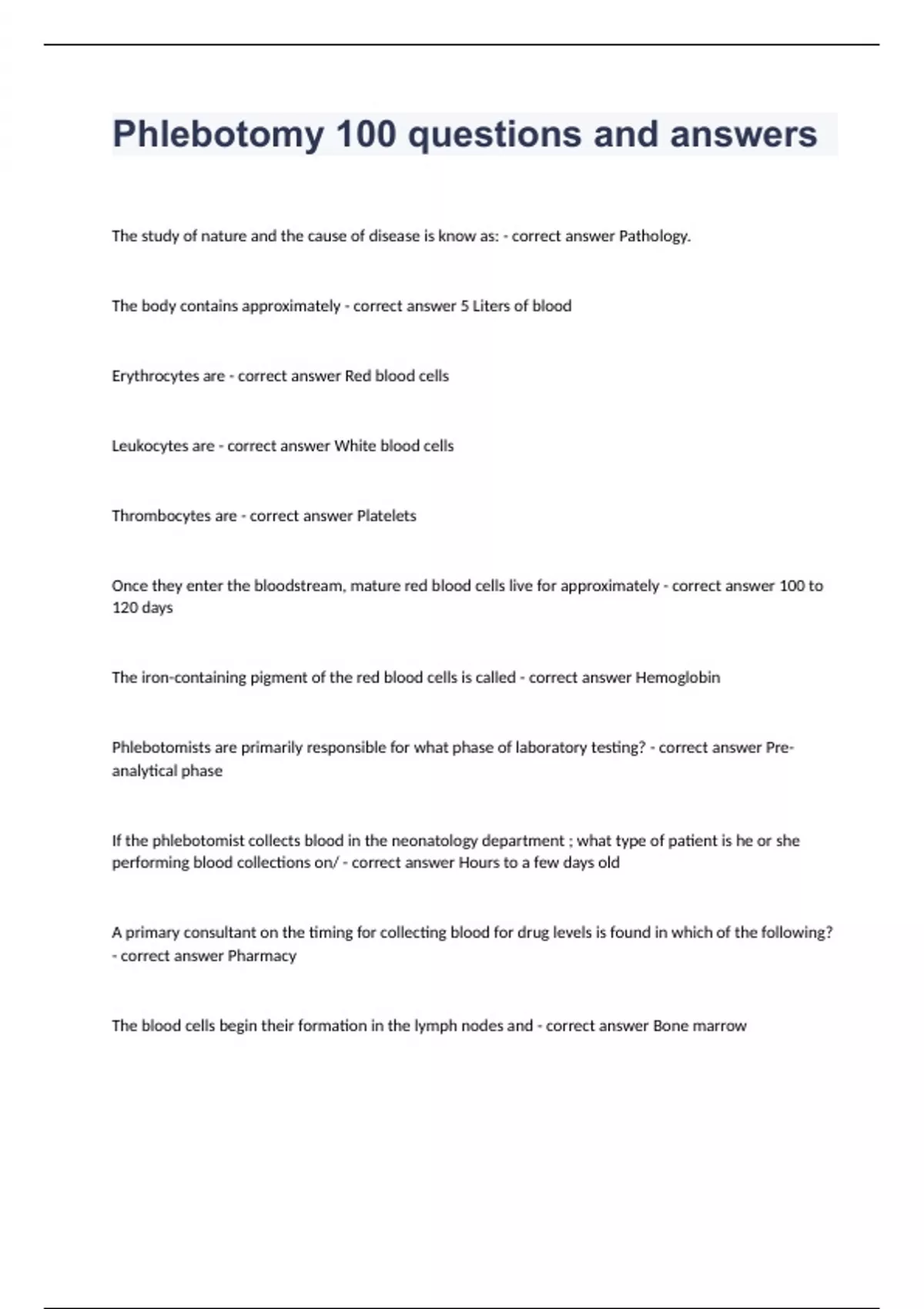 Phlebotomy 100 questions and answersThe study of nature and the cause of disease is know as: - correct answer Pathology. The body contains approximately - correct answer 5 Liters of blood Erythrocytes are - correct answer Red blood cells Leukocytes are - correct answer White blood cells Thrombocytes are - correct answer Platelets Once they enter the bloodstream, mature red blood cells live for approximately - correct answer 100 to 120 days The iron-containing pigment of the red blood cells is called - correct answer Hemoglobin Phlebotomists are primarily responsible for what phase of laboratory testing? - correct answer Pre-analytical phase If the phlebotomist collects blood in the neonatology department ; what type of patient is he or she performing blood collections on/ - correct answer Hours to a few days old A primary consultant on the timing for collecting blood for drug levels is found in which of the following? - correct answer Pharmacy The blood cells begin their formation in the lymph nodes and - correct answer Bone marrow Flowcharts can be used in quality improvement methodologies and are designed to assist in - correct answer Breaking out components into a diagram to understand a process Quality improvement for specimen collection frequently involve all except - correct answer Negative drug reaction Pareto charts can be used in quality improvement methodologies and are designed to assist in - correct answer Making bar charts that show frequency of problems A person who has too little hemoglobin or a decreased number of red blood cells is known to be - correct answer Anemic The process of determining if a person will react after a transfusion is called a - correct answer Type and cross-match The formed elements of the blood make up only - correct answer 45% of the total volume Liquid (plasma) makes up - correct answer 55% of the total volume of the blood When the blood is removed from the body, the blood clots and the liquid portion is called - correct answer Serum The instrument used to speed the removal of serum by spinning the blood is called - correct answer a Centrifuge the supine position refers to which of the following? - correct answer Lying face-up on their back what is ''RFID''? - correct answer Identification tag using silicon ships and wireless receiver What is the blood PH range of a normal body? - correct answer 7.35 to 7.45