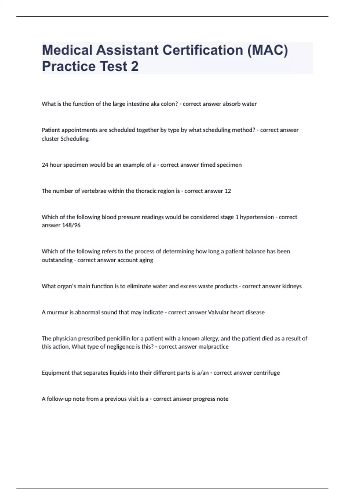 Medical Assistant Certification (MAC) Practice Test 2 What is the function of the large intestine aka colon? - correct answer absorb water Patient appointments are scheduled together by type by what scheduling method? - correct answer cluster Scheduling 24 hour specimen would be an example of a - correct answer timed specimen The number of vertebrae within the thoracic region is - correct answer 12 Which of the following blood pressure readings would be considered stage 1 hypertension - correct answer 148/96 Which of the following refers to the process of determining how long a patient balance has been outstanding - correct answer account aging What organ's main function is to eliminate water and excess waste products - correct answer kidneys A murmur is abnormal sound that may indicate - correct answer Valvular heart disease The physician prescribed penicillin for a patient with a known allergy, and the patient died as a result of this action, What type of negligence is this? - correct answer malpractice Equipment that separates liquids into their different parts is a/an - correct answer centrifuge A follow-up note from a previous visit is a - correct answer progress note A baby's pulse and respiration rate are; - correct answer faster than an adult An invoice for the monthly rent of the building where the medical office is located is typically handled by which department? - correct answer accounts payable When looking on the imprinted numbers on a check, the second series of numbers is the - correct answer account number Scheduling structure where no appointment is needed and patients are seen in order of arrival is called - correct answer open hours The interval between the exposure to infection and the appearance of the first symptom is called - correct answer incubation period complete destruction of all forms of microbial life - correct answer sterilization How long how has the pain been going on and on a scale from 1-10 with 10 being the worst pain of your life? How would you describe the pain? is an example of - correct answer an open ended question notifiable infections must be reported to - correct answer Center for Disease Control When a patient fails to show for an appointment the event must be - correct answer documented in the patient's chart Which of the following is the most common means o transmitting pathogens - correct answer touching The body organ targeted by HBV is - correct answer liver The hormone that triggers the body's reaction in fight or flight is called - correct answer epinephrine Which mode of infection transmission occurs from touching contaminated lines - correct answer vehicle