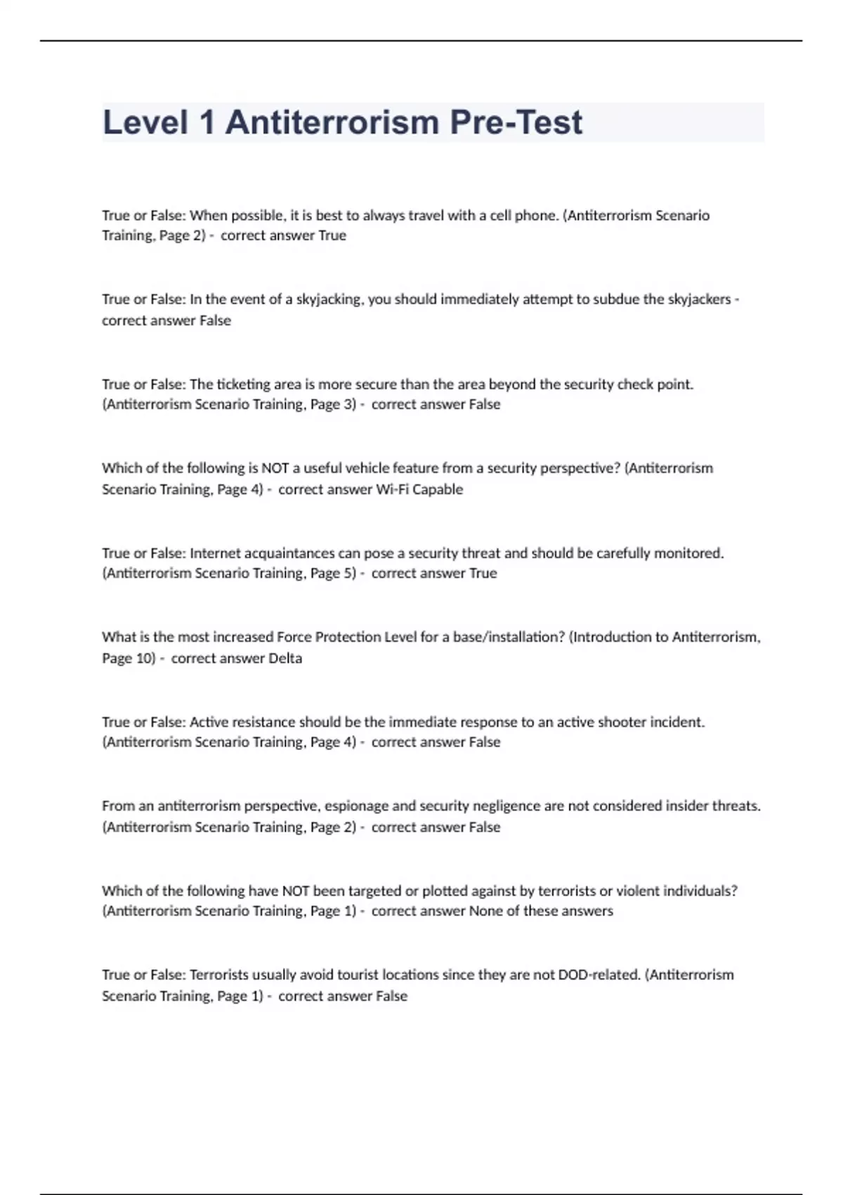 Level 1 Antiterrorism Pre-Test True or False: When possible, it is best to always travel with a cell phone. (Antiterrorism Scenario Training, Page 2) - correct answer True True or False: In the event of a skyjacking, you should immediately attempt to subdue the skyjackers - correct answer False True or False: The ticketing area is more secure than the area beyond the security check point. (Antiterrorism Scenario Training, Page 3) - correct answer False Which of the following is NOT a useful vehicle feature from a security perspective? (Antiterrorism Scenario Training, Page 4) - correct answer Wi-Fi Capable True or False: Internet acquaintances can pose a security threat and should be carefully monitored. (Antiterrorism Scenario Training, Page 5) - correct answer True What is the most increased Force Protection Level for a base/installation? (Introduction to Antiterrorism, Page 10) - correct answer Delta True or False: Active resistance should be the immediate response to an active shooter incident. (Antiterrorism Scenario Training, Page 4) - correct answer False From an antiterrorism perspective, espionage and security negligence are not considered insider threats. (Antiterrorism Scenario Training, Page 2) - correct answer False Which of the following have NOT been targeted or plotted against by terrorists or violent individuals? (Antiterrorism Scenario Training, Page 1) - correct answer None of these answers True or False: Terrorists usually avoid tourist locations since they are not DOD-related. (Antiterrorism Scenario Training, Page 1) - correct answer False What is NOT a physical security measure for your home? (Antiterrorism Scenario Training, Page 2) - correct answer Hiding a key outside to ensure family members can get in if they lose their keys Select all factors that are ways in which you might become the victim of a terrorist attack. (Introduction to Antiterrorism, Page 4) - correct answer Location Association Opportunity Predictability Alerts from the National Terrorism Advisory System apply only to the United States and its possessions. (Introduction to Antiterrorism, Page 12) - correct answer True What is NOT a terrorist method of surveillance? (Antiterrorism Scenario Training, Page 3) - correct answer Breaking and entering to steal valuables True or False: The initial moments of a hostage taking incident can be extremely dangerous. (Antiterrorism Scenario Training, Page 2) - correct answer True Which of the following are NOT an Antiterrorism Level I theme? Select all that apply. (Antiterrorism Scenario Training, Page 2) - correct answer Collections Counter-surveillance Which one of these does NOT pose a risk to security at a government facility? (Antiterrorism Scenario Training, Page 2) - correct answer A person expressing boredom with the US mission True or False: Room invasions are not a significant security issue for hotels located within the United States. (Antiterrorism Scenario Training, Page 1) - correct answer False True or False: Individuals should Fight as last resort and only when your life is in imminent danger. (Active Shooter Fundamentals, Page 4) - correct answer True