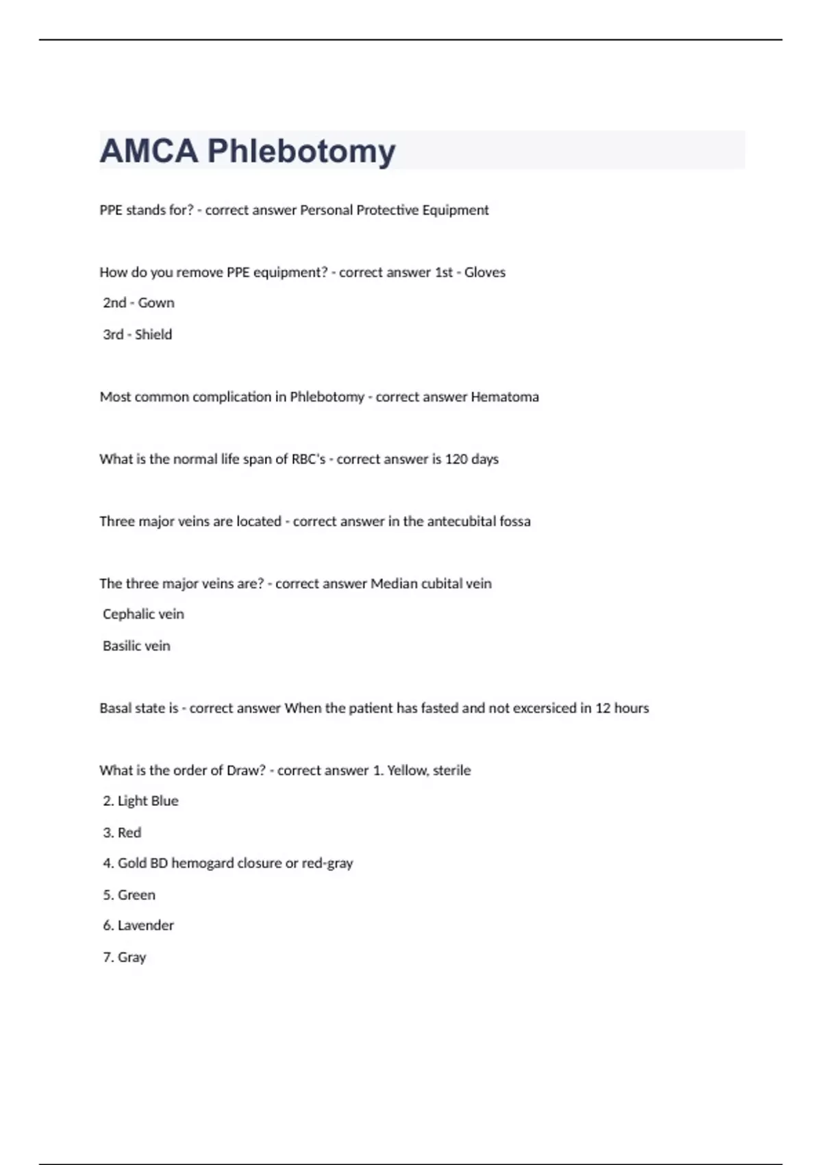 AMCA PhlebotomyPPE stands for? - correct answer Personal Protective Equipment How do you remove PPE equipment? - correct answer 1st - Gloves 2nd - Gown 3rd - Shield Most common complication in Phlebotomy - correct answer Hematoma What is the normal life span of RBC's - correct answer is 120 days Three major veins are located - correct answer in the antecubital fossa The three major veins are? - correct answer Median cubital vein Cephalic vein Basilic vein Basal state is - correct answer When the patient has fasted and not excersiced in 12 hours What is the order of Draw? - correct answer 1. Yellow, sterile 2. Light Blue 3. Red 4. Gold BD hemogard closure or red-gray 5. Green 6. Lavender 7. Gray