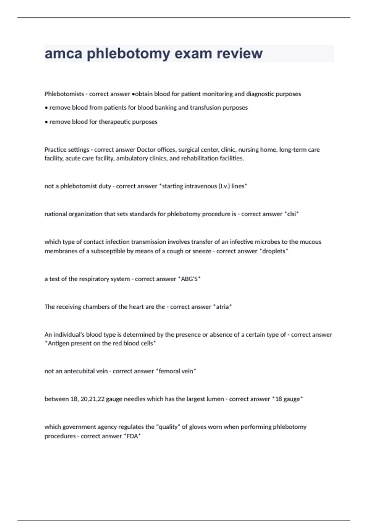 amca phlebotomy exam review Phlebotomists - correct answer •obtain blood for patient monitoring and diagnostic purposes • remove blood from patients for blood banking and transfusion purposes • remove blood for therapeutic purposes Practice settings - correct answer Doctor offices, surgical center, clinic, nursing home, long-term care facility, acute care facility, ambulatory clinics, and rehabilitation facilities. not a phlebotomist duty - correct answer *starting intravenous (I.v.) lines* national organization that sets standards for phlebotomy procedure is - correct answer *clsi* which type of contact infection transmission involves transfer of an infective microbes to the mucous membranes of a subsceptible by means of a cough or sneeze - correct answer *droplets* a test of the respiratory system - correct answer *ABG'S* The receiving chambers of the heart are the - correct answer *atria* An individual's blood type is determined by the presence or absence of a certain type of - correct answer *Antigen present on the red blood cells* not an antecubital vein - correct answer *femoral vein* between 18, 20,21,22 gauge needles which has the largest lumen - correct answer *18 gauge* which government agency regulates the "quality" of gloves worn when performing phlebotomy procedures - correct answer *FDA*
