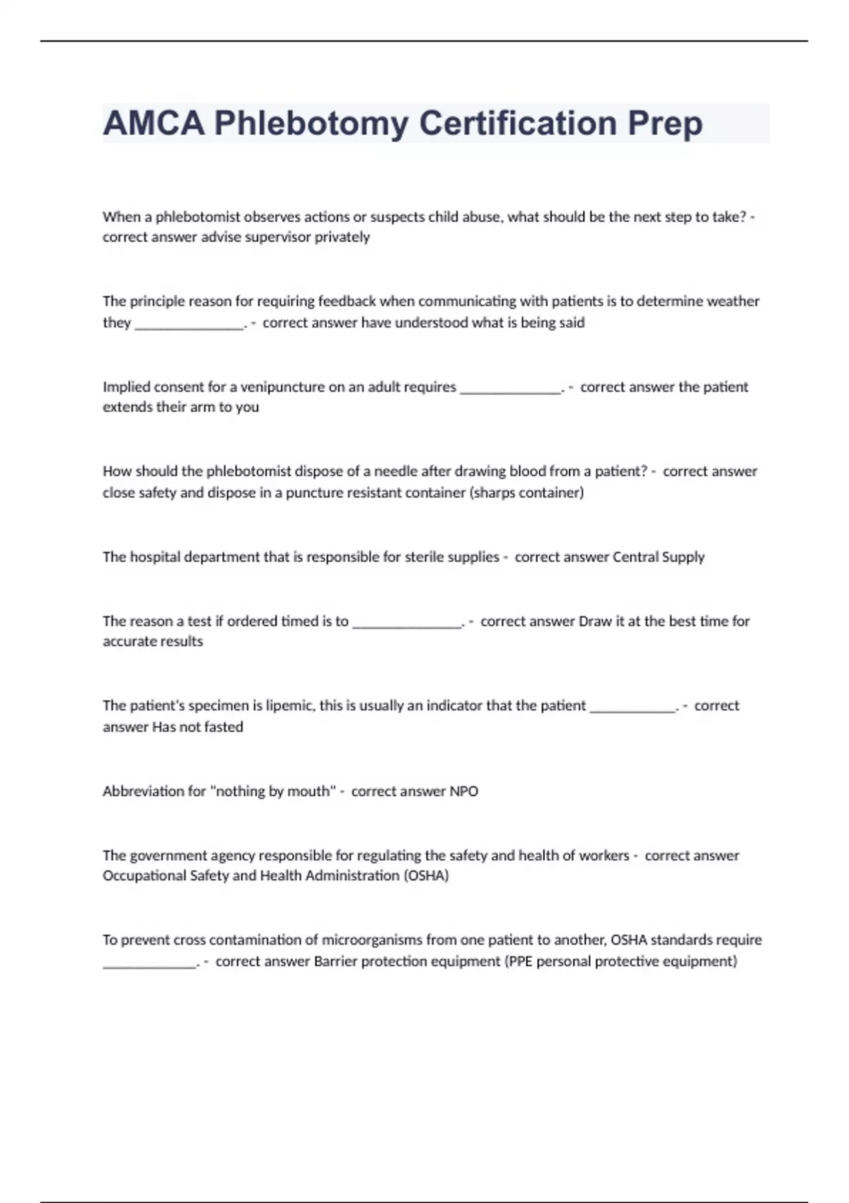 AMCA Phlebotomy Certification PrepWhen a phlebotomist observes actions or suspects child abuse, what should be the next step to take? - correct answer advise supervisor privately The principle reason for requiring feedback when communicating with patients is to determine weather they ______________. - correct answer have understood what is being said Implied consent for a venipuncture on an adult requires _____________. - correct answer the patient extends their arm to you How should the phlebotomist dispose of a needle after drawing blood from a patient? - correct answer close safety and dispose in a puncture resistant container (sharps container) The hospital department that is responsible for sterile supplies - correct answer Central Supply The reason a test if ordered timed is to ______________. - correct answer Draw it at the best time for accurate results The patient's specimen is lipemic, this is usually an indicator that the patient ___________. - correct answer Has not fasted Abbreviation for "nothing by mouth" - correct answer NPO The government agency responsible for regulating the safety and health of workers - correct answer Occupational Safety and Health Administration (OSHA) To prevent cross contamination of microorganisms from one patient to another, OSHA standards require ____________. - correct answer Barrier protection equipment (PPE personal protective equipment)
