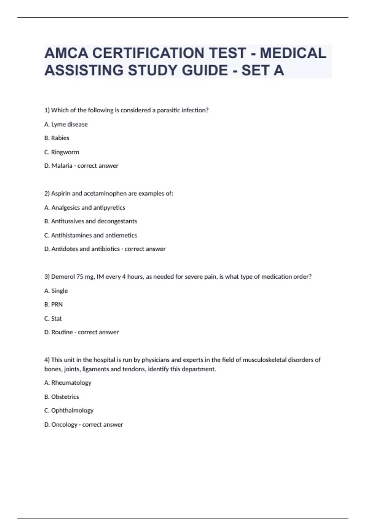 AMCA CERTIFICATION TEST - MEDICAL ASSISTING STUDY GUIDE - SET A 1) Which of the following is considered a parasitic infection? A. Lyme disease B. Rabies C. Ringworm D. Malaria - correct answer 2) Aspirin and acetaminophen are examples of: A. Analgesics and antipyretics B. Antitussives and decongestants C. Antihistamines and antiemetics D. Antidotes and antibiotics - correct answer 3) Demerol 75 mg, IM every 4 hours, as needed for severe pain, is what type of medication order? A. Single B. PRN C. Stat D. Routine - correct answer 4) This unit in the hospital is run by physicians and experts in the field of musculoskeletal disorders of bones, joints, ligaments and tendons, identify this department. A. Rheumatology B. Obstetrics C. Ophthalmology D. Oncology - correct answer 5) MSDS information includes: A. Table of chemical elements B. Product manufacturing conditions C. General and emergency information D. Information on competitor products - correct answer 6) The physician prescribes a buccal medication. The medical assistant should instruct the patient to: A. Place the medication between the lower teeth and cheek B. Chew the medication and swallow it C. Place the medication under the tongue D. Dissolve the medication in water and drink it - correct answer 7) Which of the following is the best specimen to test for levels of iron in the blood? A. The one collected in a tube that contains sodium citrate B. The one collected in a microcuvette C. The one collected in the tube that contains EDTA D. The one collected in a tube with no additive - correct answer 8) All pathogens are: A. Microorganisms that live in soil B. Microbes that can cause disease C. Communicable microorganisms D. Normal bacteria found on skin - correct answer 9) Every prescription for a controlled substance requires the physicians signature and a ____________ number? A. FDA B. DEA C.EPA D.CDC - correct answer 10) When using a No. 10 envelope, where should the address be placed? A. 10 lines down from the top and 4 inches from the left edge of the envelope B. 14 lines down from the top and 2 inches from the left edge of the envelope C. 10 lines down from the top and 2 inches from the left edge of the envelope D. 14 lines down from the top and 4 inches from the left edge of the envelope - correct answer 11) What drug prevents the action of another drug or chemical? A. Trade B. Narcotic C. Synergist D. Antagonist - correct answer 12) Co-insurance is calculated based on a: A. A capitation rate B. Percentage of charge C. A fixed charge for each visit D. Number of policy holders in the plan - correct answer 13) Muscles that act on the knee joint exhibit two actions: A. Adduction and lateral rotation B. Medical rotation and extension C. Adduction and Abduction D. Flexion and extension - correct answer 14) A structure that is composed of two or more tissue types is called a/an: A. System B. Organism