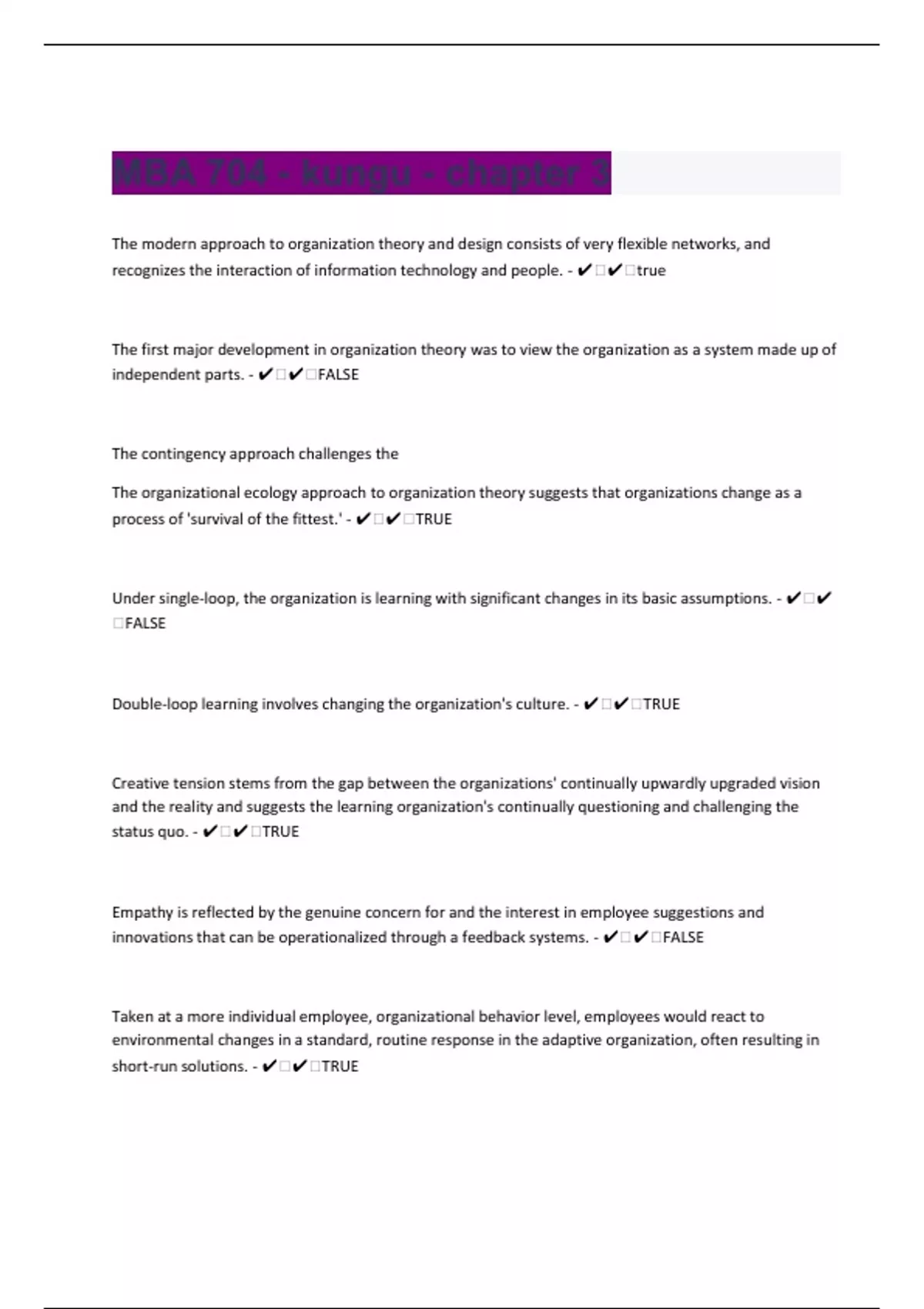The modern approach to organization theory and design consists of very flexible networks, and recognizes the interaction of information technology and people. - ️️true The first major development in organization theory was to view the organization as a system made up of independent parts. - ️️FALSE The contingency approach challenges the The organizational ecology approach to organization theory suggests that organizations change as a process of 'survival of the fittest.' - ️️TRUE Under single-loop, the organization is learning with significant changes in its basic assumptions. - ️️FALSE Double-loop learning involves changing the organization's culture. - ️️TRUE Creative tension stems from the gap between the organizations' continually upwardly upgraded vision and the reality and suggests the learning organization's continually questioning and challenging the status quo. - ️️TRUE Empathy is reflected by the genuine concern for and the interest in employee suggestions and innovations that can be operationalized through a feedback systems. - ️️FALSE Taken at a more individual employee, organizational behavior level, employees would react to environmental changes in a standard, routine response in the adaptive organization, often resulting in short-run solutions. - ️️TRUE