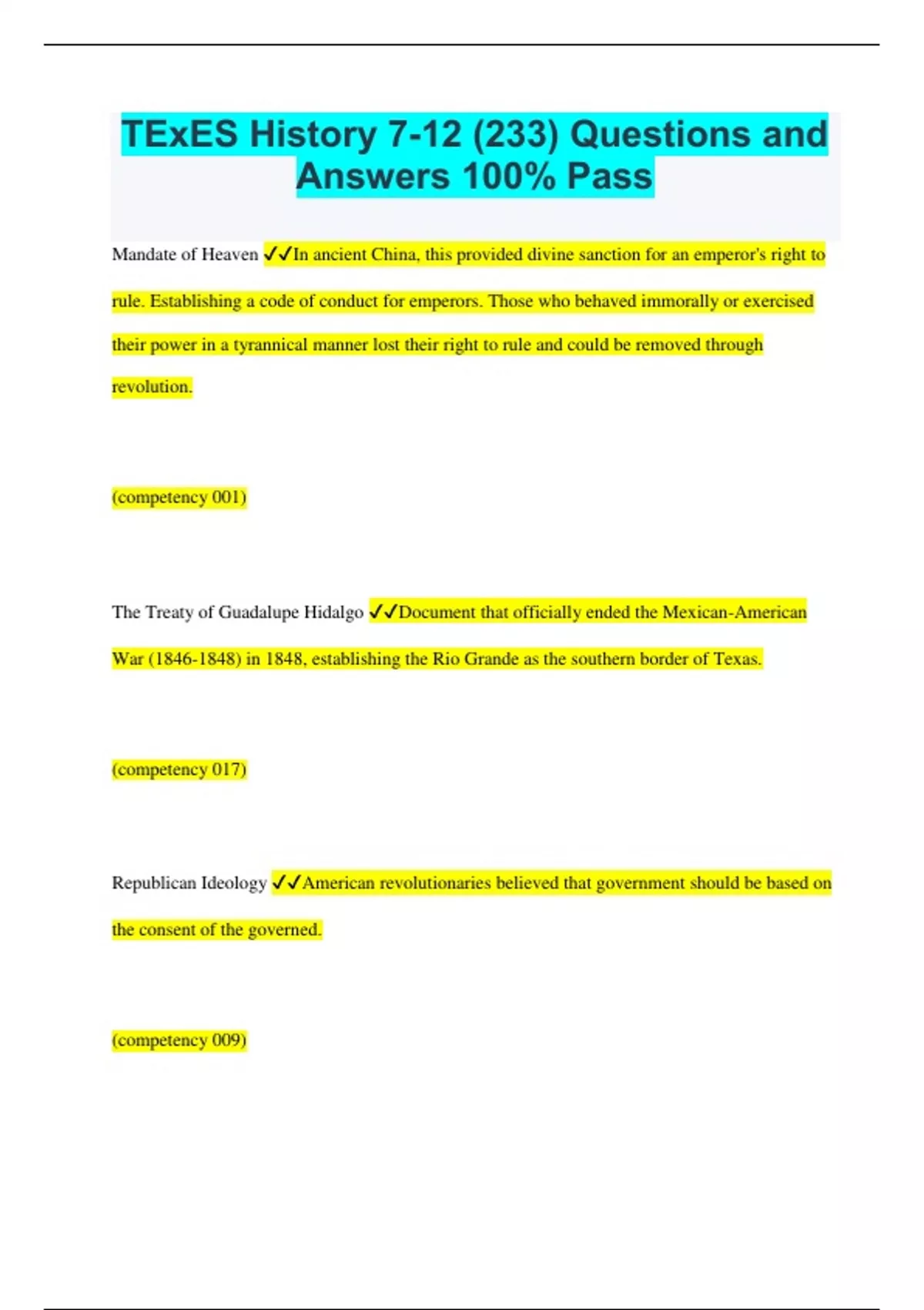 TExES History 7-12 (233) Questions and Answers 100% Pass