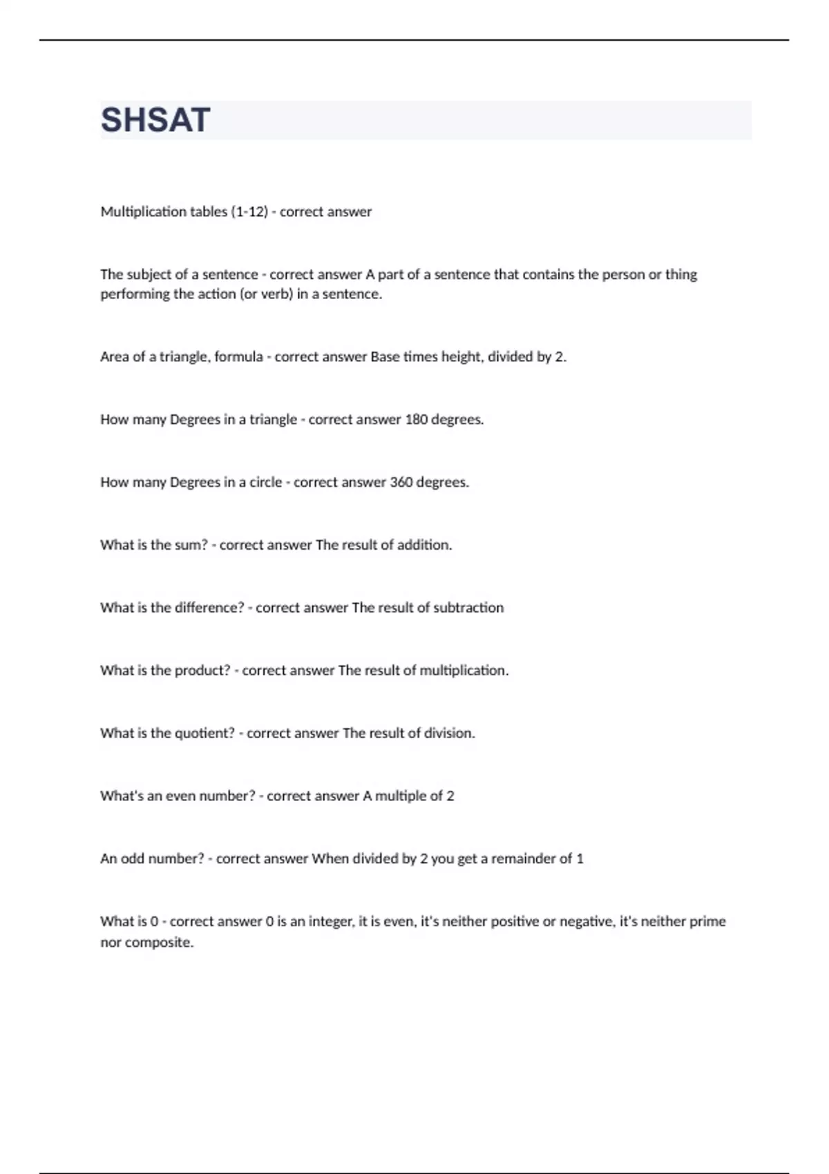 SHSATMultiplication tables (1-12) - correct answer The subject of a sentence - correct answer A part of a sentence that contains the person or thing performing the action (or verb) in a sentence. Area of a triangle, formula - correct answer Base times height, divided by 2. How many Degrees in a triangle - correct answer 180 degrees. How many Degrees in a circle - correct answer 360 degrees. What is the sum? - correct answer The result of addition. What is the difference? - correct answer The result of subtraction What is the product? - correct answer The result of multiplication. What is the quotient? - correct answer The result of division. What's an even number? - correct answer A multiple of 2 An odd number? - correct answer When divided by 2 you get a remainder of 1 What is 0 - correct answer 0 is an integer, it is even, it's neither positive or negative, it's neither prime nor composite.