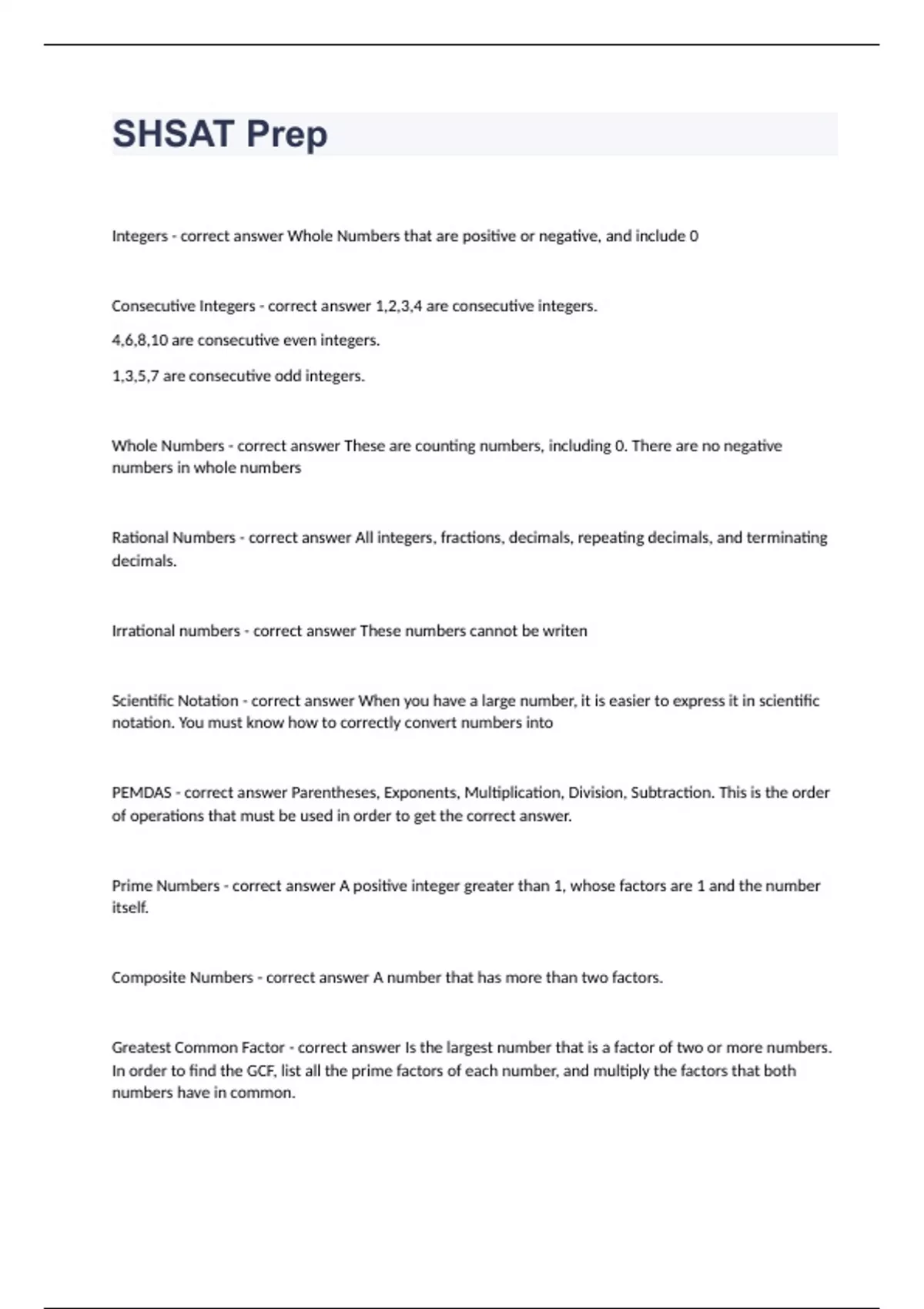SHSAT PrepIntegers - correct answer Whole Numbers that are positive or negative, and include 0 Consecutive Integers - correct answer 1,2,3,4 are consecutive integers. 4,6,8,10 are consecutive even integers. 1,3,5,7 are consecutive odd integers. Whole Numbers - correct answer These are counting numbers, including 0. There are no negative numbers in whole numbers Rational Numbers - correct answer All integers, fractions, decimals, repeating decimals, and terminating decimals. Irrational numbers - correct answer These numbers cannot be writen Scientific Notation - correct answer When you have a large number, it is easier to express it in scientific notation. You must know how to correctly convert numbers into PEMDAS - correct answer Parentheses, Exponents, Multiplication, Division, Subtraction. This is the order of operations that must be used in order to get the correct answer. Prime Numbers - correct answer A positive integer greater than 1, whose factors are 1 and the number itself. Composite Numbers - correct answer A number that has more than two factors. Greatest Common Factor - correct answer Is the largest number that is a factor of two or more numbers. In order to find the GCF, list all the prime factors of each number, and multiply the factors that both numbers have in common.