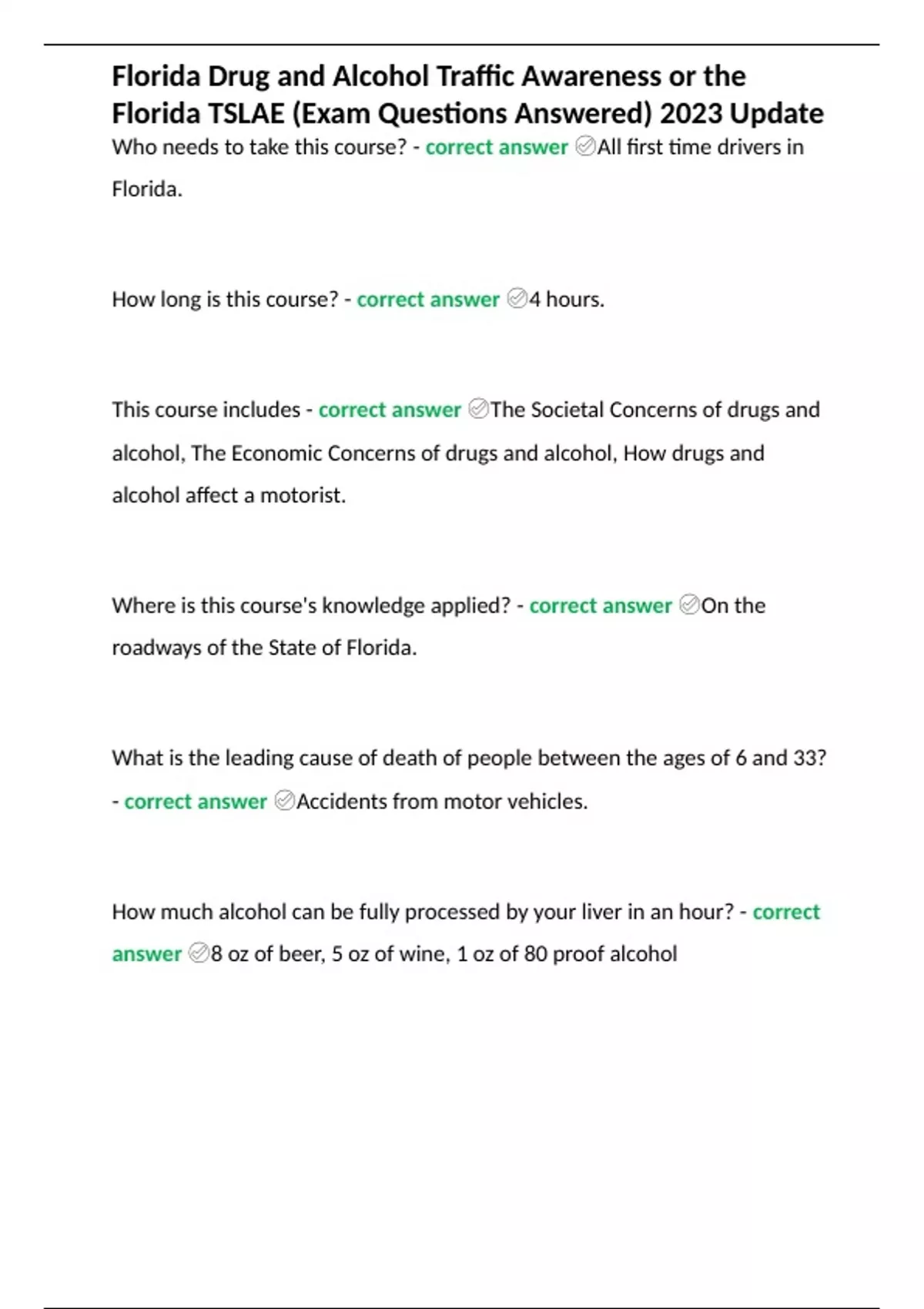 Summary Florida Drug and Alcohol Traffic Awareness or the Florida TSLAE (Exam Questions Answered) 2023 Update