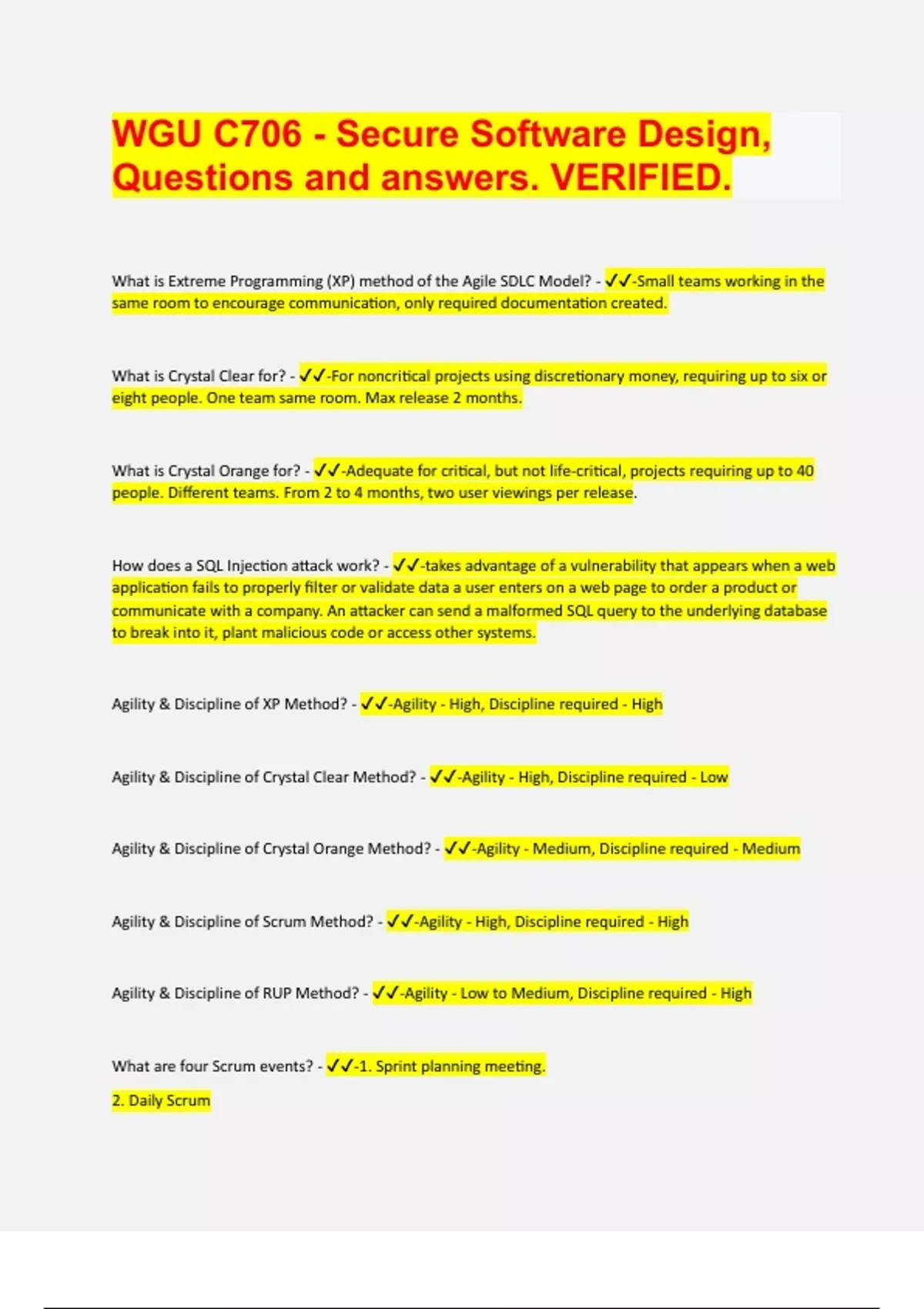 What is Extreme Programming (XP) method of the Agile SDLC Model? - -Small teams working in the same room to encourage communication, only required documentation created. What is Crystal Clear for? - -For noncritical projects using discretionary money, requiring up to six or eight people. One team same room. Max release 2 months. What is Crystal Orange for? - -Adequate for critical, but not life-critical, projects requiring up to 40 people. Different teams. From 2 to 4 months, two user viewings per release. How does a SQL Injection attack work? - -takes advantage of a vulnerability that appears when a web application fails to properly filter or validate data a user enters on a web page to order a product or communicate with a company. An attacker can send a malformed SQL query to the underlying database to break into it, plant malicious code or access other systems. Agility & Discipline of XP Method? - -Agility - High, Discipline required - High Agility & Discipline of Crystal Clear Method? - -Agility - High, Discipline required - Low Agility & Discipline of Crystal Orange Method? - -Agility - Medium, Discipline required - Medium Agility & Discipline of Scrum Method? - -Agility - High, Discipline required - High