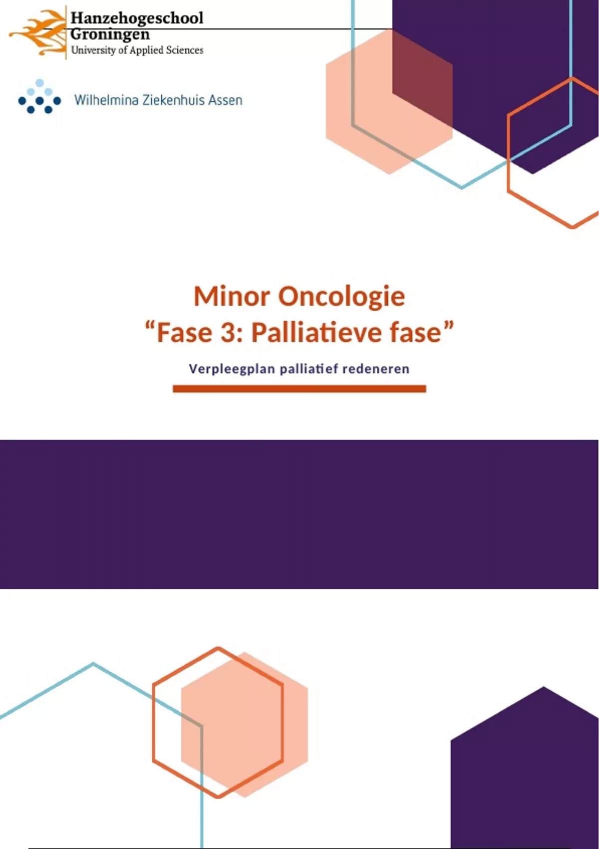 Dit verslag bevat een palliatief verpleegplan bij een oncologische casus. Palliatieve zorg is ‘Leven toevoegen aan de dagen, niet dagen aan het leven’. Daarbij is het doel om het leven zo prettig mogelijk te maken, ondanks het ziek zijn. Dit wordt gedaan door het voorkomen en/of verminderen van klachten. De mensen om de zieke heen spelen hierbij ook een grote rol, daarom richt palliatieve zorg zich ook op de naasten. Kwaliteit van leven staat voorop. Daarbij staan de naasten, dokters, verpleegkundigen, verzorgenden, een psycholoog, een geestelijk verzorger, vrijwilligers en andere zorgverleners ook centraal. Dit verslag/plan kreeg een zeer goede beoordeling. Hierin zit zowel de casus, geneeskundige methodiek, omschrijving van het kwaliteitskader palliatieve zorg in Nederland, pro-actief verpleegplan in de palliatieve fases, palliatief redeneren volgens de 4 stappen, nazorg en rouwverwerking in verwerkt.