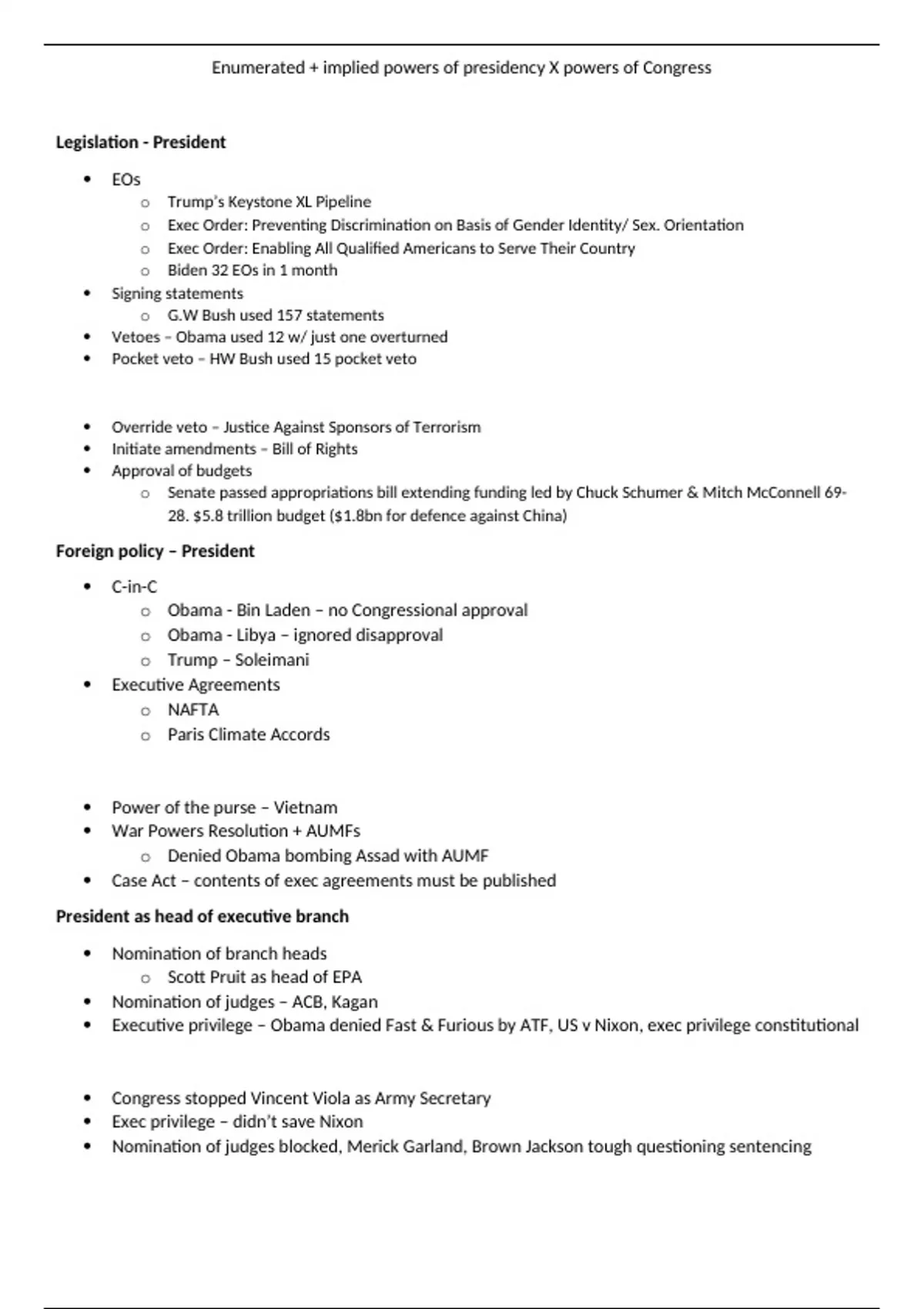 Essay Plan: Evaluate the view that the implied & enumerated powers of the President are more powerful than those of Congress