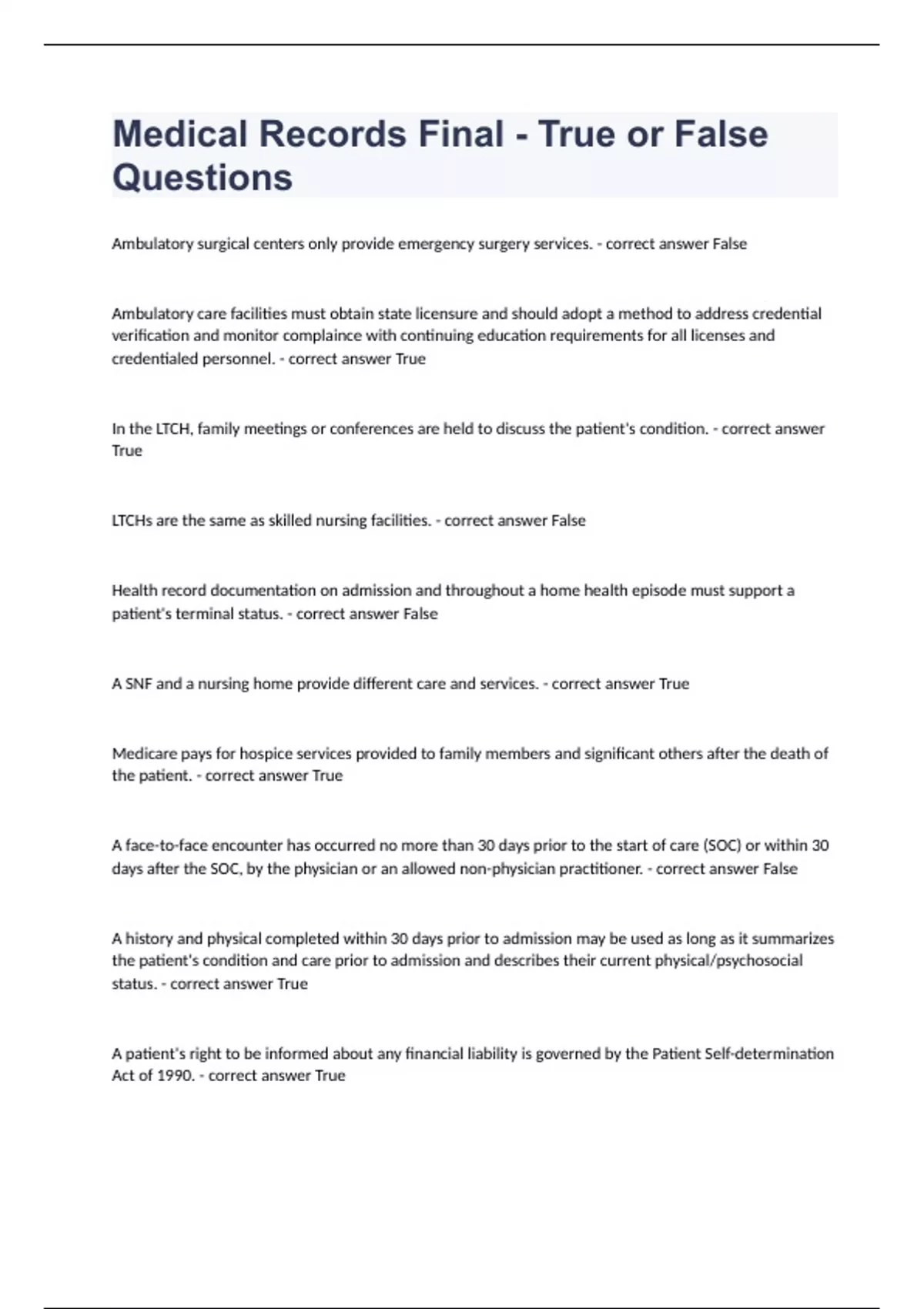 Medical Records Final - True or False QuestionsAmbulatory surgical centers only provide emergency surgery services. - correct answer False Ambulatory care facilities must obtain state licensure and should adopt a method to address credential verification and monitor complaince with continuing education requirements for all licenses and credentialed personnel. - correct answer True In the LTCH, family meetings or conferences are held to discuss the patient's condition. - correct answer True LTCHs are the same as skilled nursing facilities. - correct answer False Health record documentation on admission and throughout a home health episode must support a patient's terminal status. - correct answer False A SNF and a nursing home provide different care and services. - correct answer True Medicare pays for hospice services provided to family members and significant others after the death of the patient. - correct answer True A face-to-face encounter has occurred no more than 30 days prior to the start of care (SOC) or within 30 days after the SOC, by the physician or an allowed non-physician practitioner. - correct answer False A history and physical completed within 30 days prior to admission may be used as long as it summarizes the patient's condition and care prior to admission and describes their current physical/psychosocial status. - correct answer True A patient's right to be informed about any financial liability is governed by the Patient Self-determination Act of 1990. - correct answer True